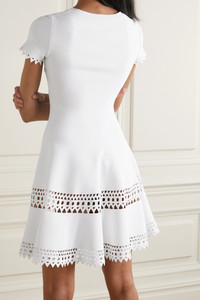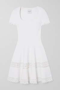 EDITORS'NOTES The exceptional thing about each Alaïa design is the fit - as noted by <i>PORTER</i>, every carefully developed fabric sculpts the body while "promoting maximum comfort and movement." This laser-cut dress is part of the brand's 'Editions' collection, which revives and revamps archival icons, and was originally debuted in Spring '16. It's made from springy stretch-knit and has a pretty scoop neckline. SIZE & FIT - Fits small to size, take one size larger than normal - Designed to be fitted at the bust and waist, slightly loose at the hip - Mid-weight, stretchy fabric - Model is 180cm/ 5’11” and is wearing a FR 38 DETAILS & CARE - White stretch-knit - Concealed zip fastening along side - 75% viscose, 25% polyester