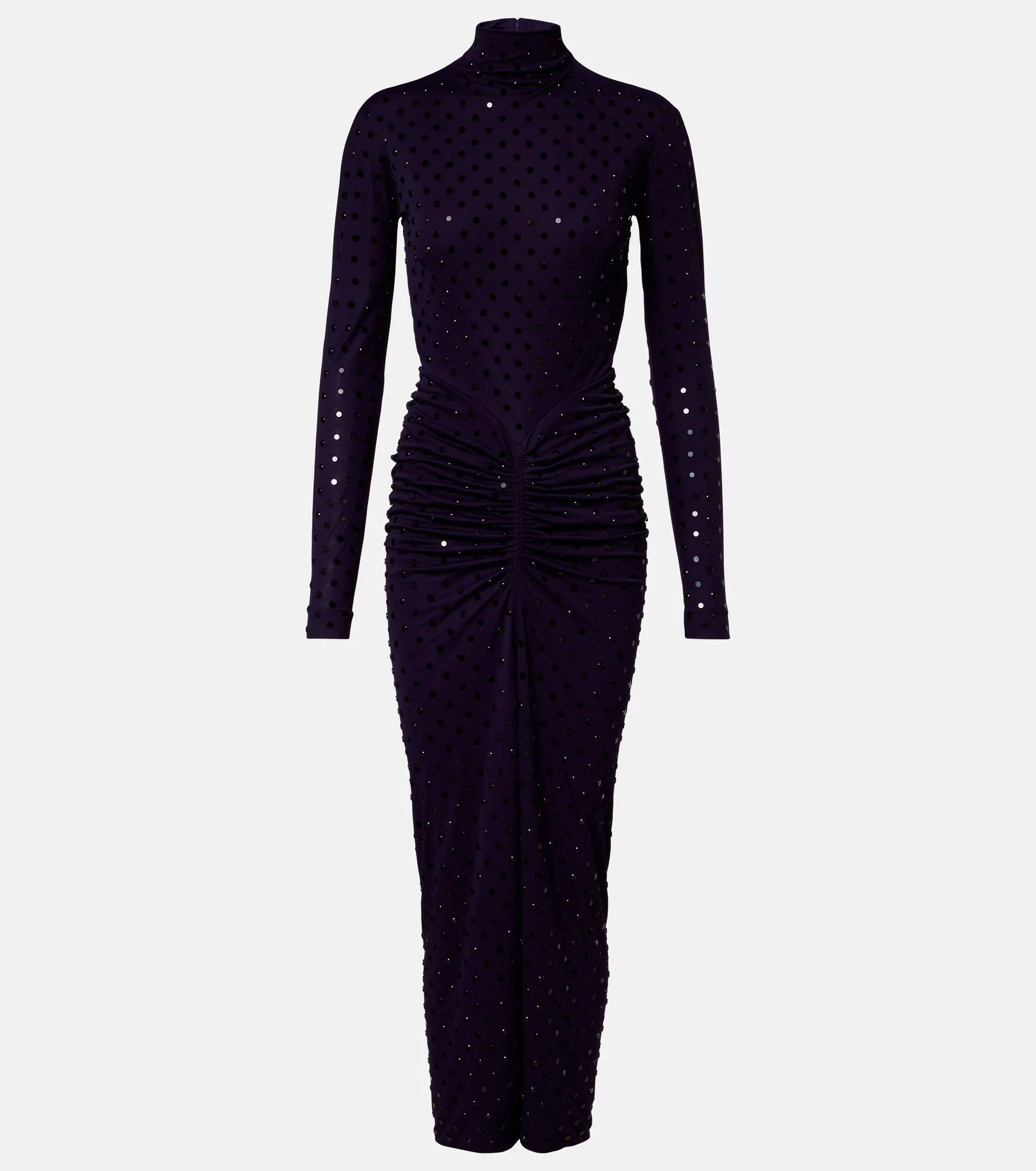 Upholding the legacy of Azzedine Alaia, the maison’s designs achieve an artful balance between sculptural and wearable. This midi dress is rendered in a deep purple hue and boasts shimmering all-over embellishments. Product Details - Material: 100% viscose - Care instructions: specialist clean - Made in Italy - Color: purple - Designer color name: Aubergine/Noir - Collar: mockneck - Closure: concealed zipped back - Item number: P01118708 Size & Fit - True to size - Fitted - Slightly stretchy fabric - Height of model is 177cm-69.5" and wears a size FR 34