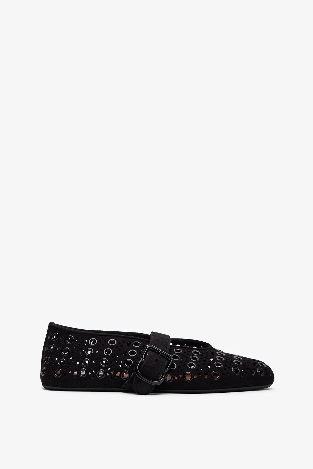 Black suede ballet flats from Alaia. The Vienne ballet flats are made of suede featuring the designer's iconic Vienne motif with buckle details, an a-line front complete with a rubber printed Vienne sole. - Rubber sole - True to size - Made in Italy Product Code: AA3A029I059999
