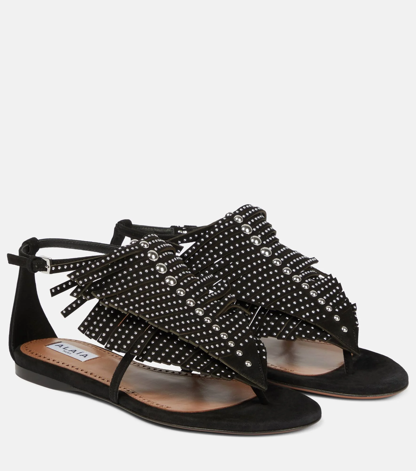 Let your footwear be the focus of your warm-weather edit with these thong sandals from Alaïa. Crafted in Italy from smooth suede, they're decorated with silver studs and leaf-like cutouts. Product Details - Toe shape: round open toe - Lining: leather - Sole: leather insole, leather and rubber sole - Upper: lamb leather - Comes with a box - Designer color name: Noir - Closure: buckle-fastening ankle strap - Made in Italy - Item number: P00635025 Size & Fit - True to size - European sizes - 2cm-1" heel (size EU 38)