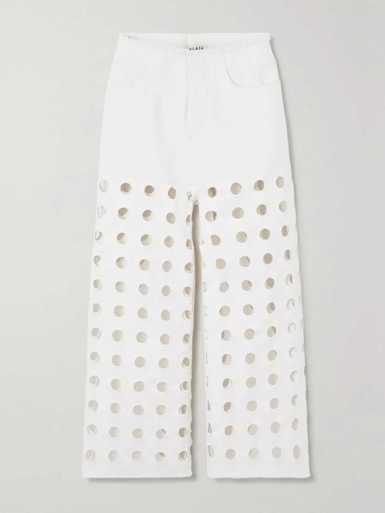 Alaia's jeans are detailed with signature laser cutouts reinforced with tonal embroidery, just like the ones on the matching vest. Made from white denim, they're frayed along the low-rise waist and cuffs.