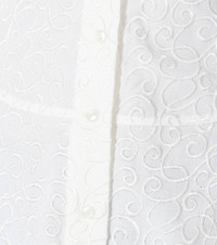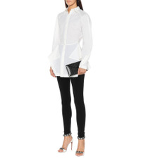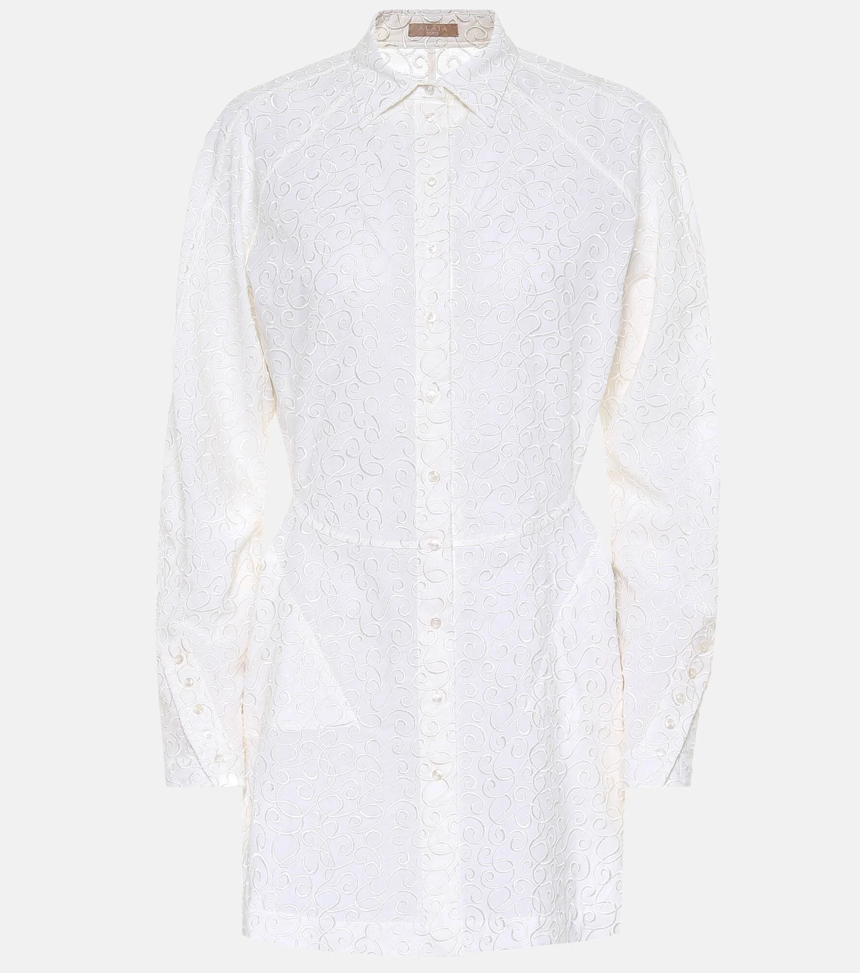 Alaïa takes the classic white shirt and makes it greater by adding an intricate embroidered overlay, as well as tailoring it to nip it in at the waist. The oversized style has been made from comfortable, gauzy wool-mousseline and is finished with peplum-style folds falling flatteringly over the hips. Wear yours day-to-night with slim black pants. Product Details - Made in Italy - Buttoned cuffs - Material: 100% wool - Designer color name: White - Closure: buttoned front - Care instructions: dry clean - Item number: P00406523 Size & Fit - True to size - Cinched waist - Mid-weight material - Falls below the hip - The model seen in the picture is 178cm-5'10" and wearing a size FR 36