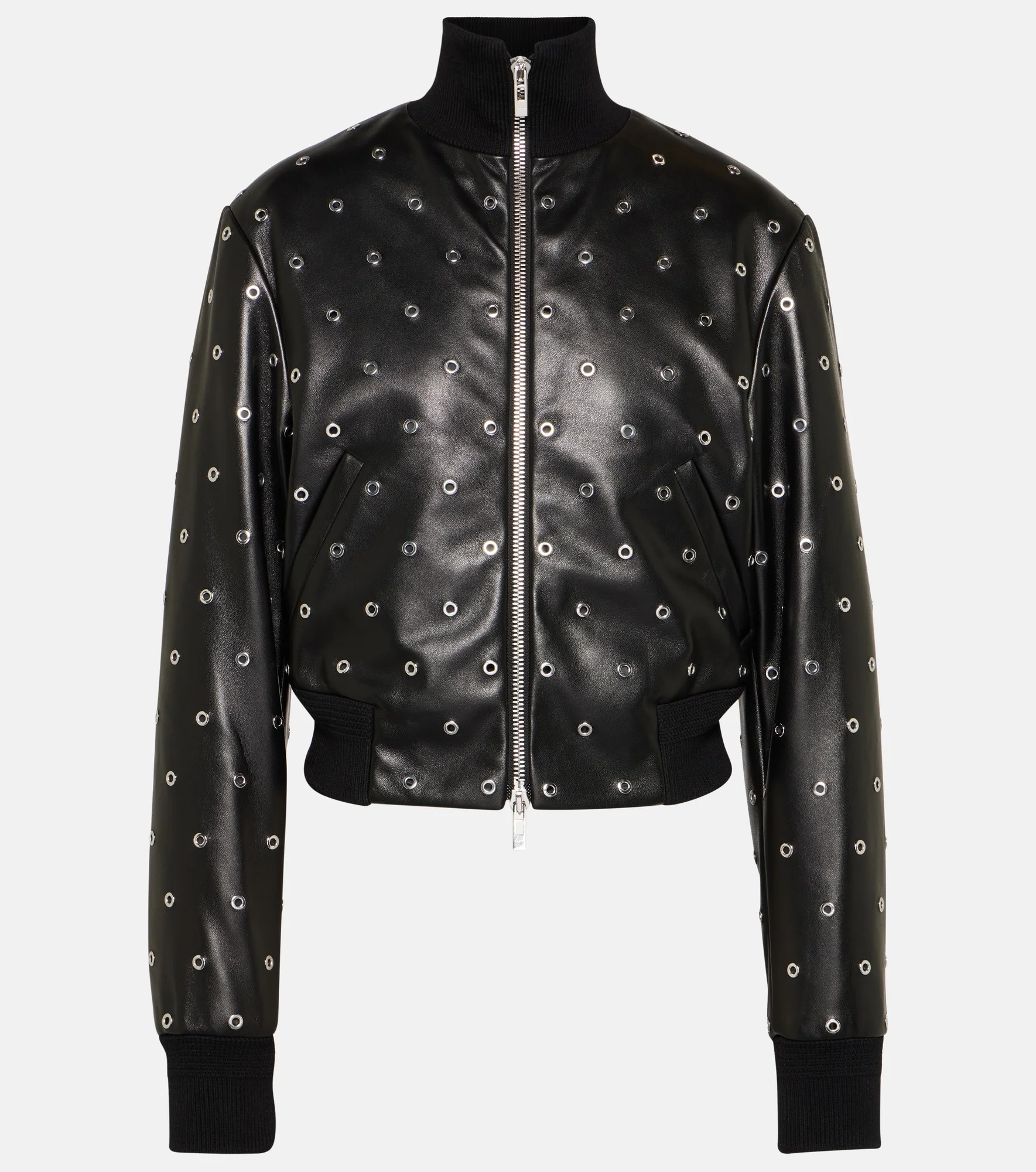 This edgy bomber jacket from Alaïa will pull together your evening looks. It's made from supple leather with perforated silver studding and boasts a drop-shoulder silhouette finished with ribbed trims. Product Details - Material: 100% lamb leather - Care instructions: do not wash - Made in Italy - Designer color name: Noir/Argent - Lining: 50% polyester, 42% silk, 8% polypropylene - Closure: zipped front - Item number: P00846509 Size & Fit - True to size - Dropped shoulders - Designed for a loose fit - Mid-weight material - Slightly cropped - The model seen in the picture is 178cm-5'10" and wearing a size FR 36