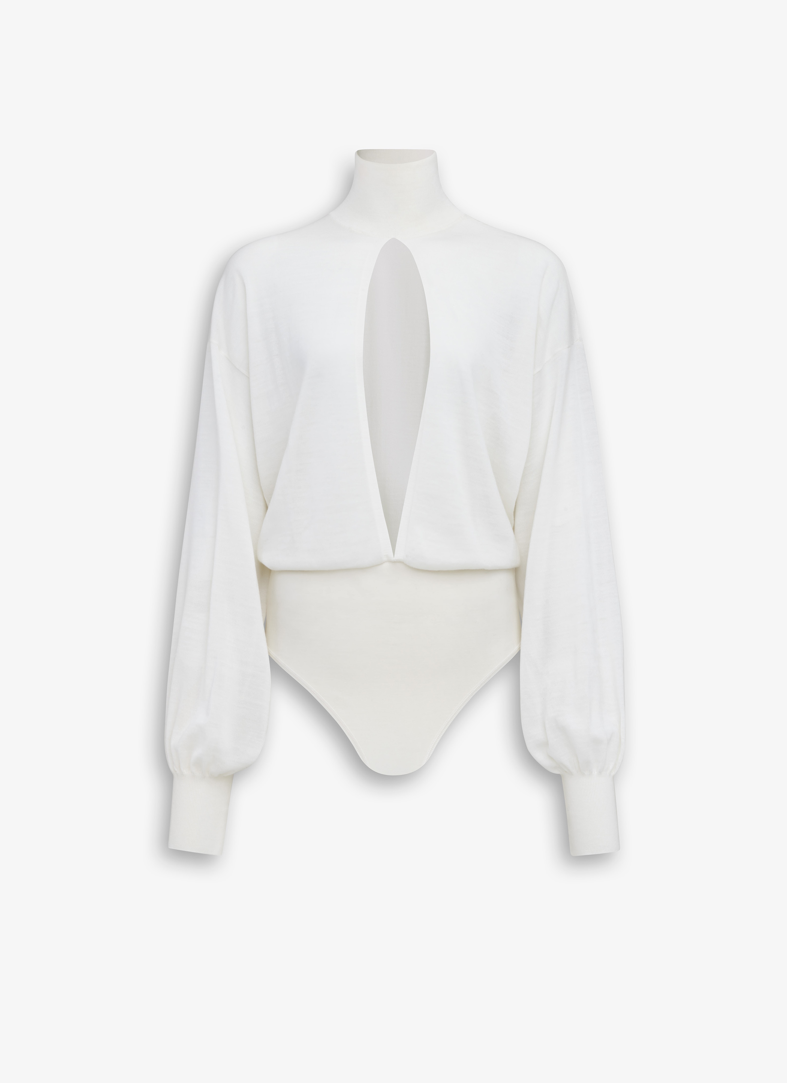 Fine knit bodysuit with slit Flowing cut High neck, long sleeves, defined waist, classic briefs Made in Italy DETAILS COMPOSITION: 86% WOOL, 13% POLYESTER, 1% POLYAMIDE PRODUCT REFERENCE: AA9B0340M922A - 054