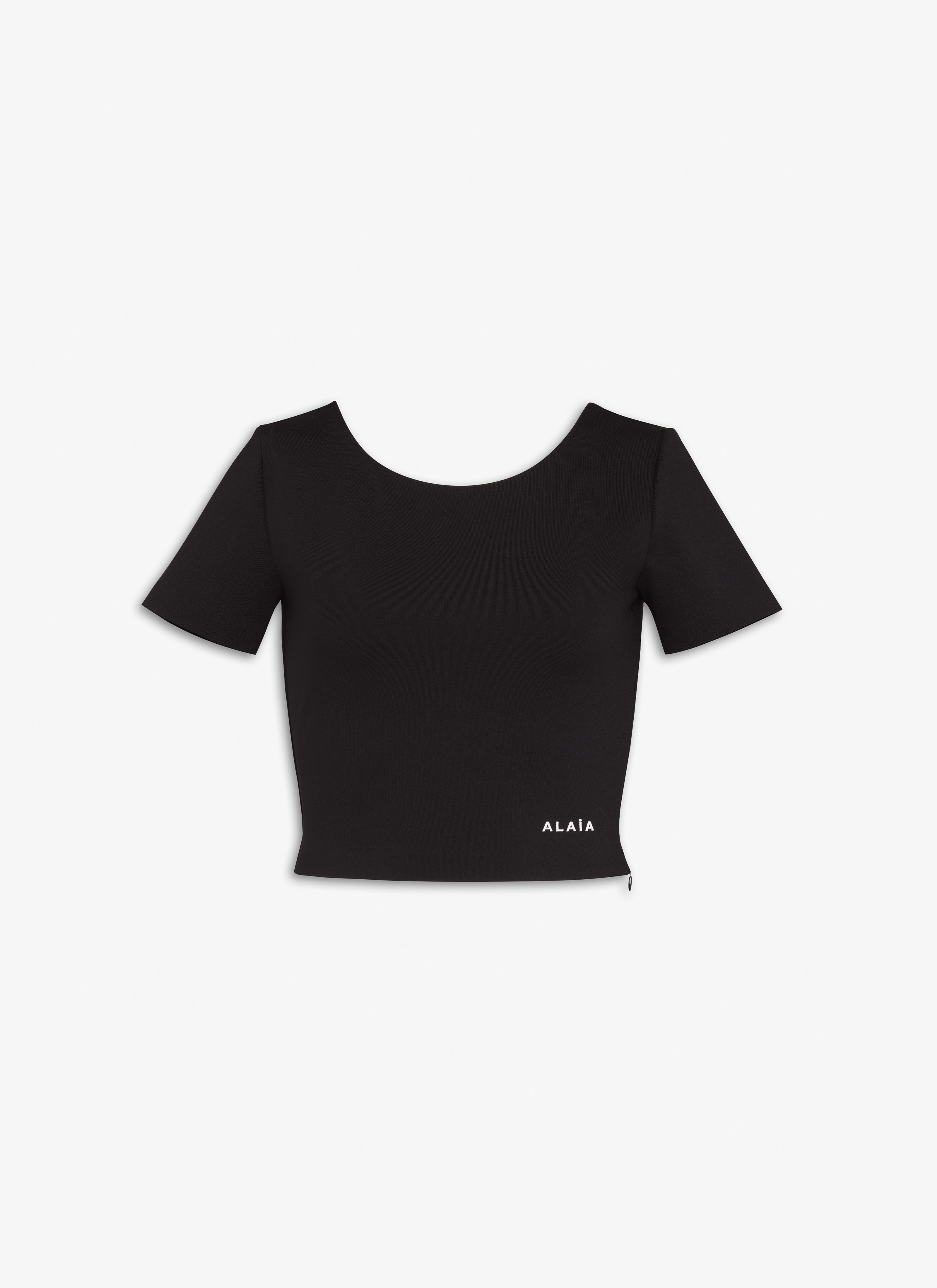 Cropped t-shirt Figure hugging Small contrasting rubber Alaïa logo on the lower left Made from sculpting jersey Made in Italy DETAILS COMPOSITION: 74% POLYAMIDE, 26% ELASTANE PRODUCT REFERENCE: AA9H04546J047 - 995