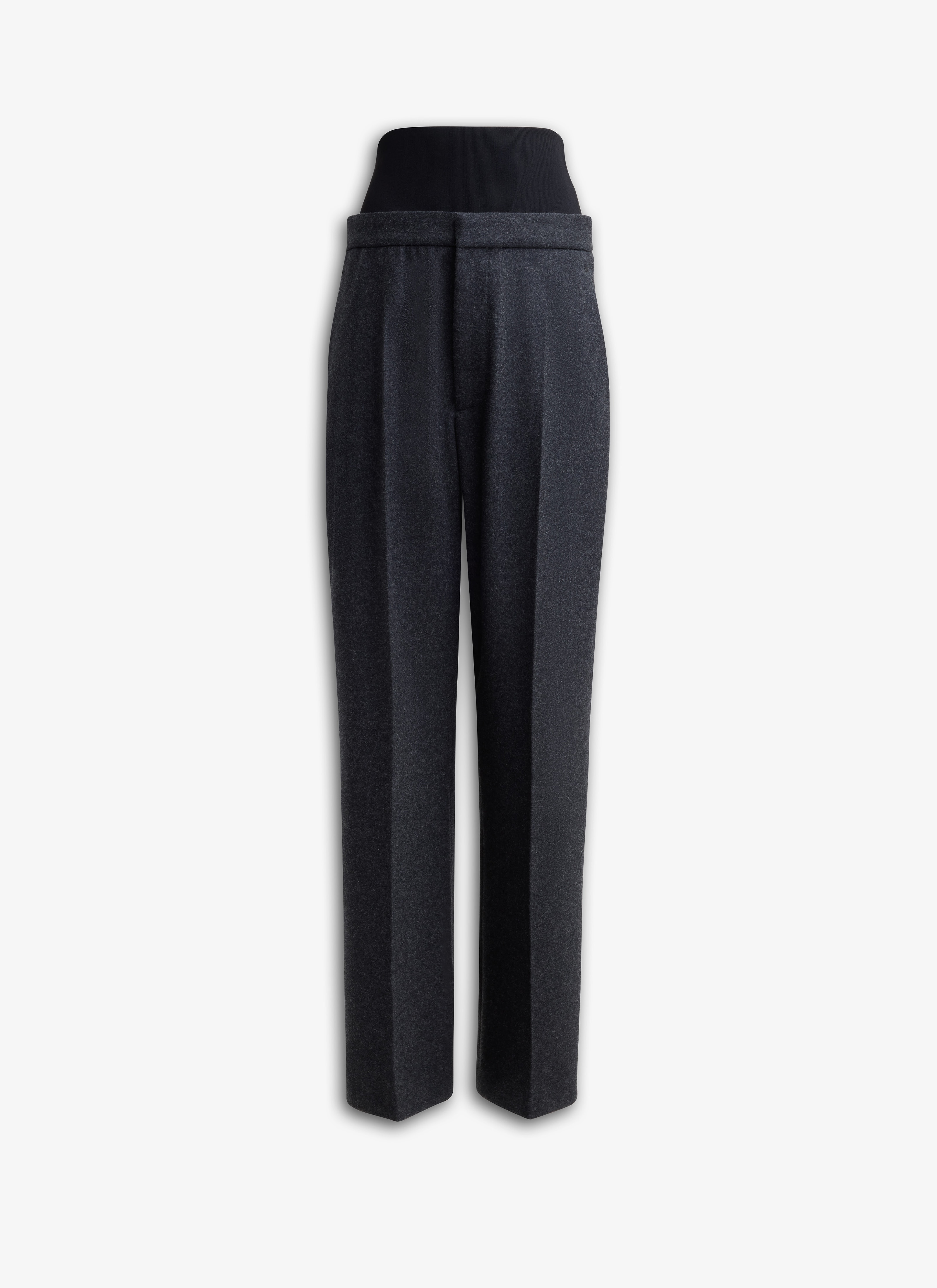 Tailored flannel pants Straight leg, cinched waist Integrated matching knit waistband, zipper Made in Italy DETAILS COMPOSITION: 100% MERINO WOOL RIBBING: 48% VISCOSE, 33% POLYAMIDE, 10% POLYESTER, 9% ELASTANE LINING POCKET: 100% COTTON PRODUCT REFERENCE: AA9P0238W011A - 840