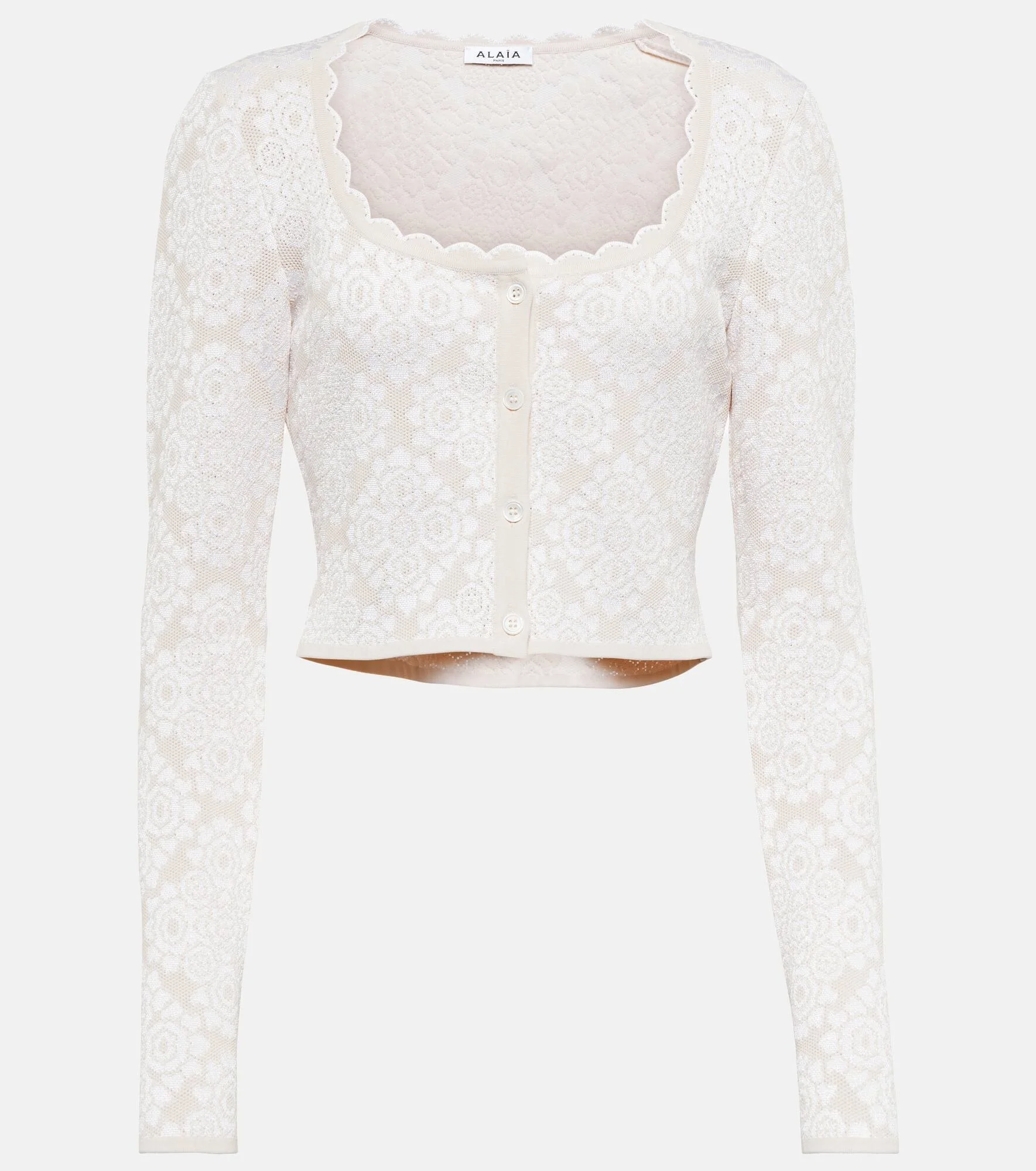 Made from a knit fabric with floral patterning, this cardigan from Alaïa has a scalloped u-neck and a cropped length. Product Details - Made in Italy - Material: 5% polyester, 83% viscose, 1% polyurethane, 11% polyamide - Closure: buttoned front - Care instructions: do not wash - Item number: P00700926 Size & Fit - True to size - Straight fit - Mid-weight material - Cropped - The model seen in the picture is 178cm-5'10" and wearing a size FR 36