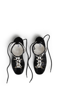 DETAILS Laced supple slippers inspired by dancing shoes Feminine laced open vamp unveiling the beginning of the toes Laces tying around the ankle Rubber sole Nappa lambskin and suede goatskin leather Made in Italy MATERIALS MAIN MATERIAL: 100% LAMB LEATHER SECONDARY MATERIAL: 100% GOAT LEATHER MAIN LINING: 100% LAMB LEATHER OUTER SOLE: 100% RUBBER PRODUCT REFERENCE: AA3A1030I208-999