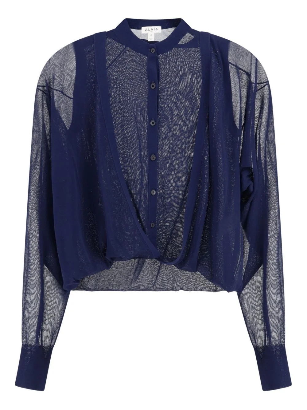 semi-sheer blouse Highlights - Navy blue - Front button fastening - Long sleeves - Layered design - Cropped Made in Italy Composition Viscose 73%, Polyamide 26%, Elastane 1% Washing instructions Read Manufacturer Guidelines