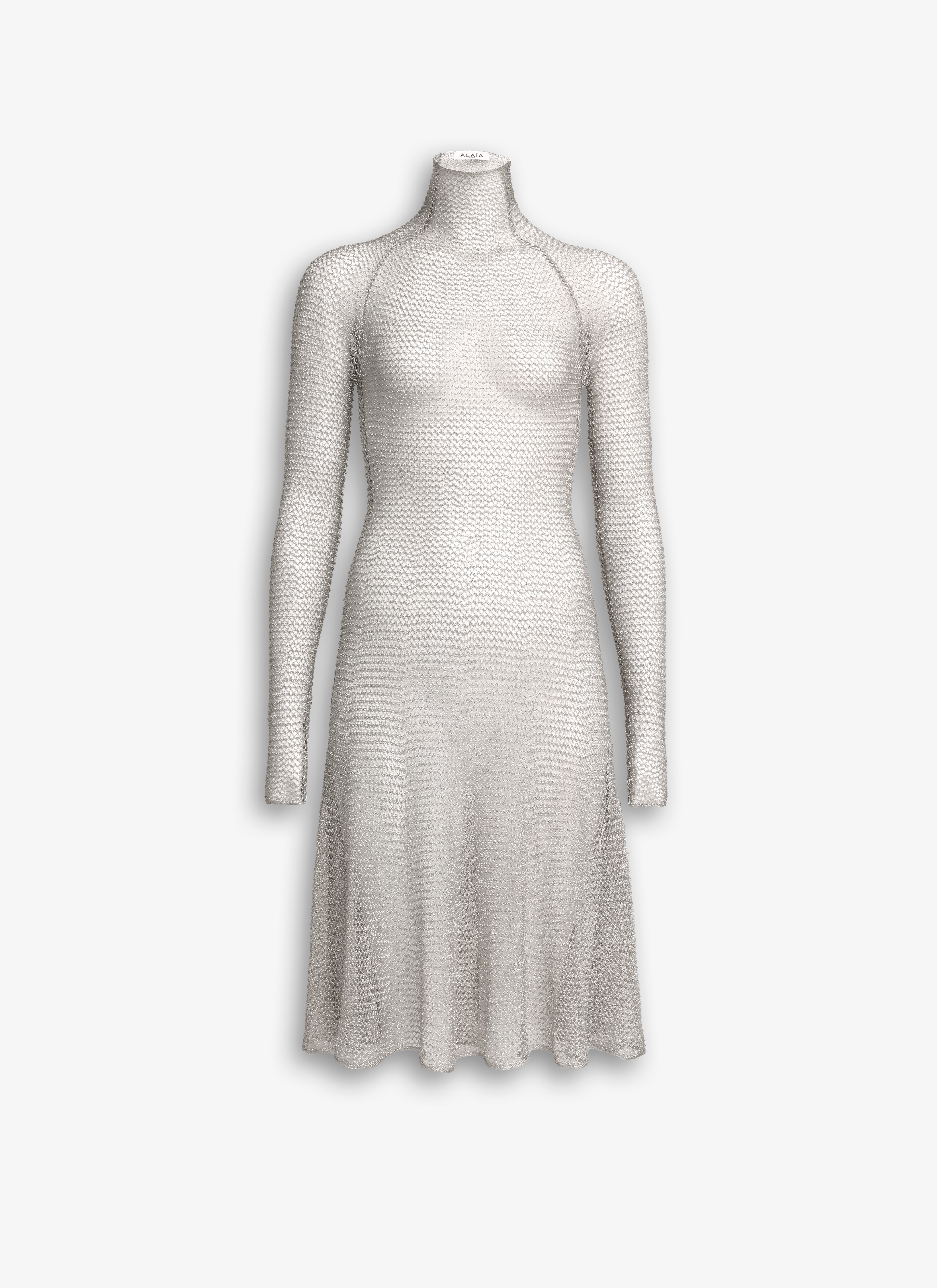 Short dress in chainmail mesh knit Long sleeves, high neck, knee length Detachable jersey lining in tonal color Made in Italy DETAILS MAIN MATERIAL: 65% VISCOSE 20% PAPER 15% POLYAMIDE MAIN LINING: 92% VISCOSE 8% ELASTANE PRODUCT REFERENCE: AA9R2615K051A - 210