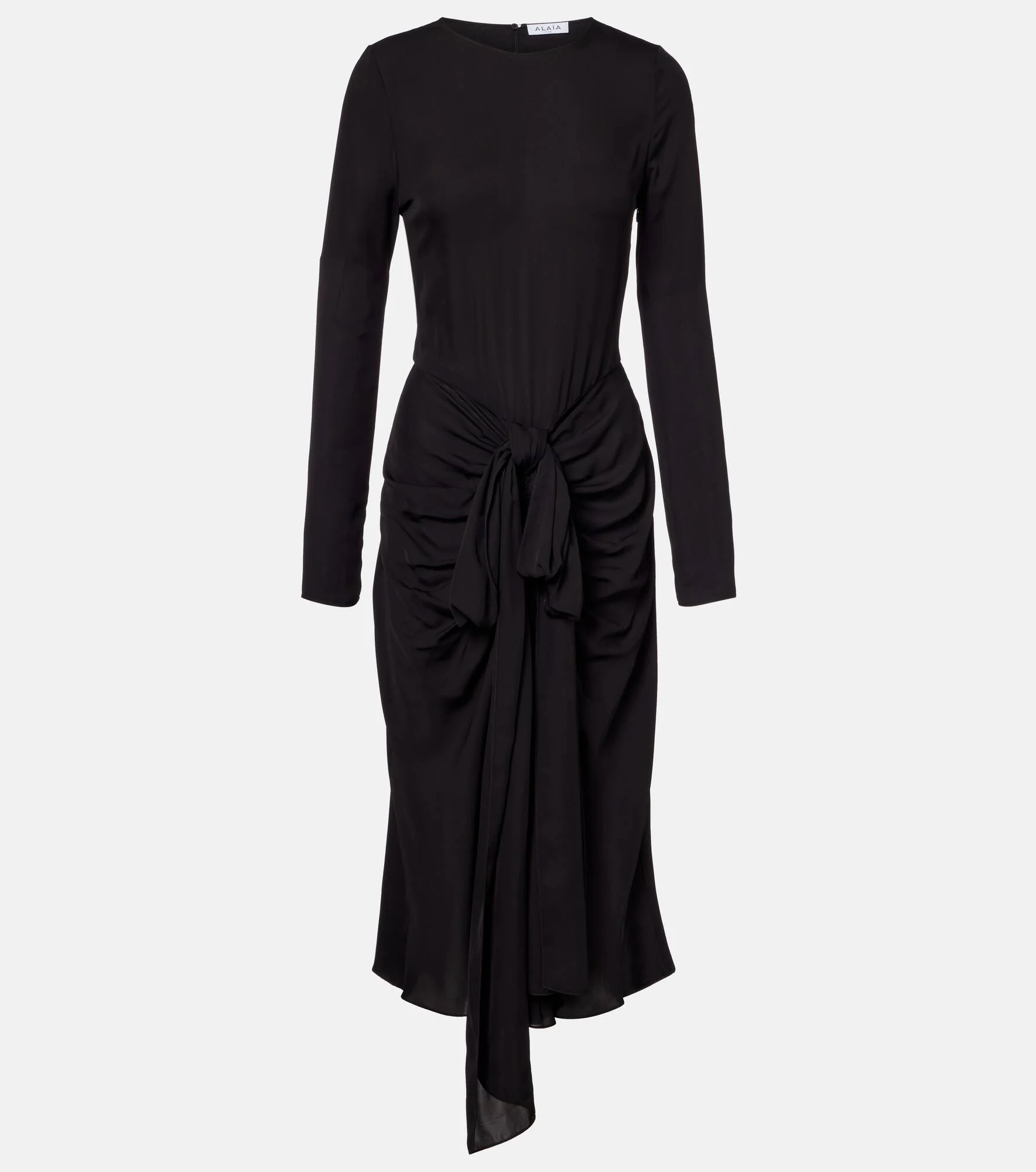 Honoring Azzedine Alaia’s legacy, Alaia’s sculptural yet wearable collections hold an artful balance that only the most skilled designers can achieve. This dress is cut to a midi length and features a charming gathered front. Product Details - Material: 100% viscose - Care instructions: dry clean - Made in Italy - Designer color name: Noir Alaia - Item color: black - Closure: concealed zipped side, hook-fastening back - Item number: P01085161 Size & Fit - True to size - Cinched waist - Non-stretchy fabric - Height of model is 174cm-68.5" and wears a size FR 34