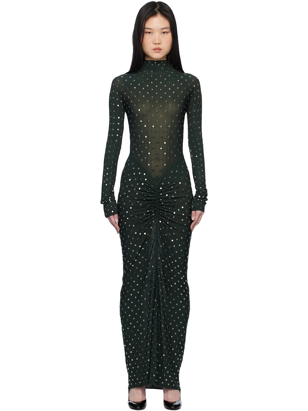 Stretch viscose jersey maxi dress. Integrated bodysuit-style underlay with press-stud fastening at bottom. · Studded detailing throughout · Mock neck · Gathering and draping at waist · Concealed zip closure at back Supplier color: Forest