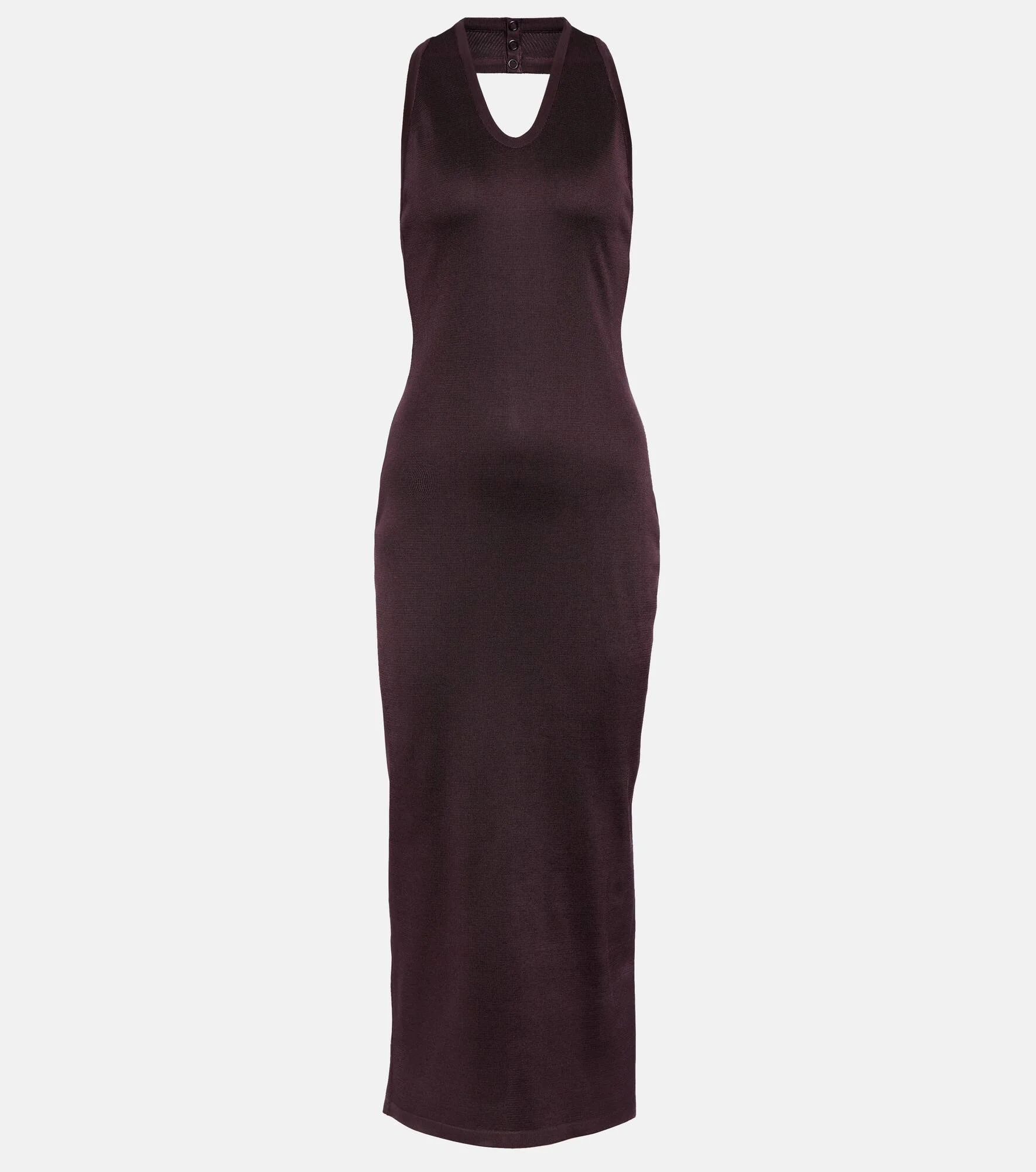 This slinky midi dress from Alaïa will be an after-dark staple for seasons to come. The minimalist design is made from lustrous knit fabric with a snap-buttoned halterneck and flattering figure-skimming drape. Product Details - Closure: snap-buttoned fastenings - Made in Italy - Material: 100% viscose - Designer color name: Aubergine - Care instructions: dry clean - Item number: P00631455 Size & Fit - True to size - Low back - Fitted - Mid-weight material - The model seen in the picture is 178cm-5'10" and wearing a size FR 36
