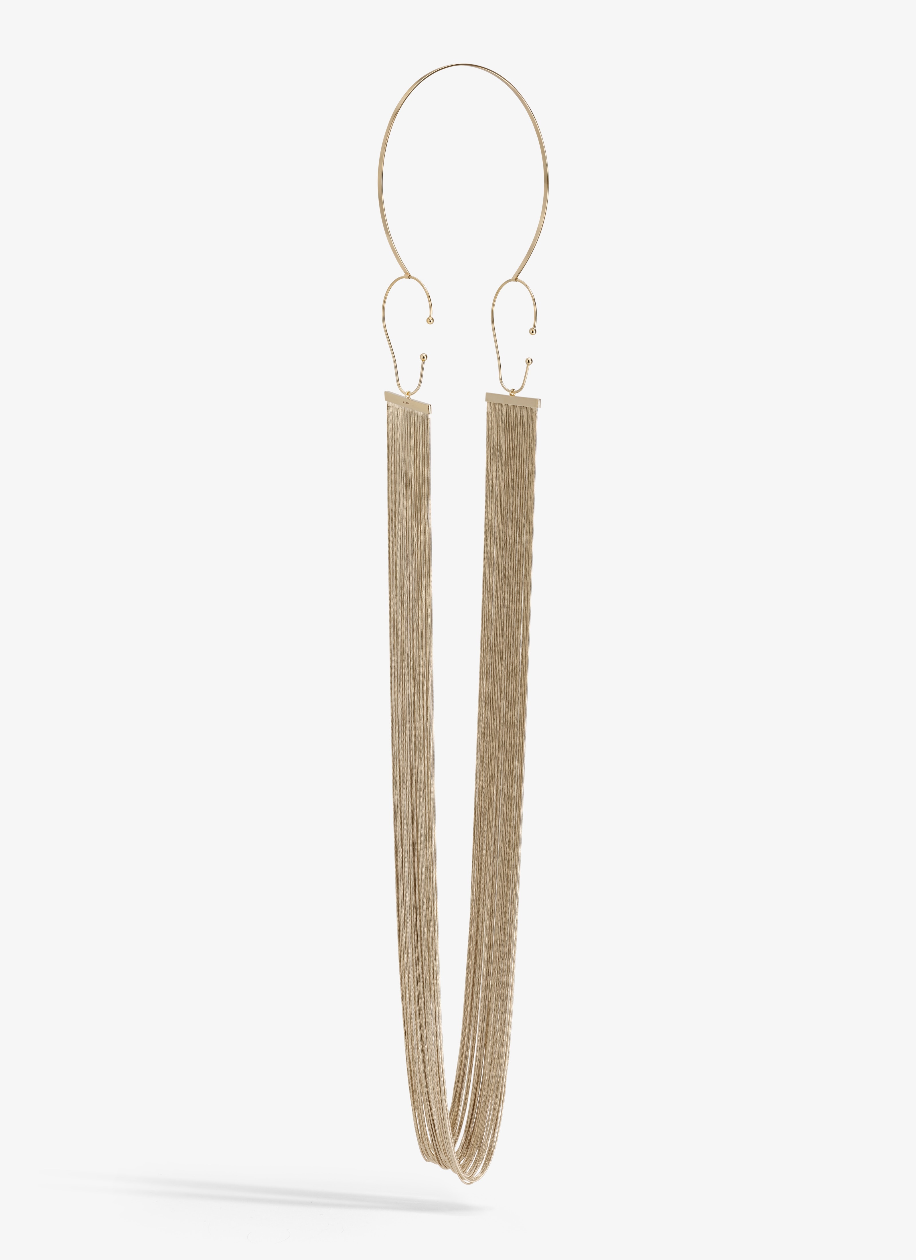 Unique headpiece Multiple delicate snake chains brought together by a light metal headband Discrete ear-shaped wire allow the piece to sit perfectly behind the ears Brass with gold finish Made in Italy DETAILS MAIN MATERIAL: 100% BRASS PRODUCT REFERENCE: AA2B140LA006 - 231