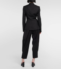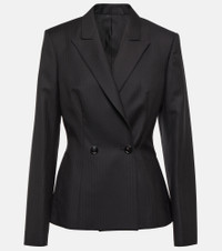This herringbone wool gabardine blazer from Alaïa is tailored in Italy into a double-breasted silhouette. The tonal design has a straight hem and cinches at the waist with large button fastenings. Product Details - Made in Italy - Material: 100% wool - Lining: partially lined, 100% cupro - Designer color name: Noir Alaia - Closure: double-breasted buttoned front - Care instructions: specialist clean - Item number: P00753119 Size & Fit - True to size - Shoulder pad inserts - Cinched waist - Mid-weight material - Falls to the hip - The model seen in the picture is 178cm-5'10" and wearing a size FR 36