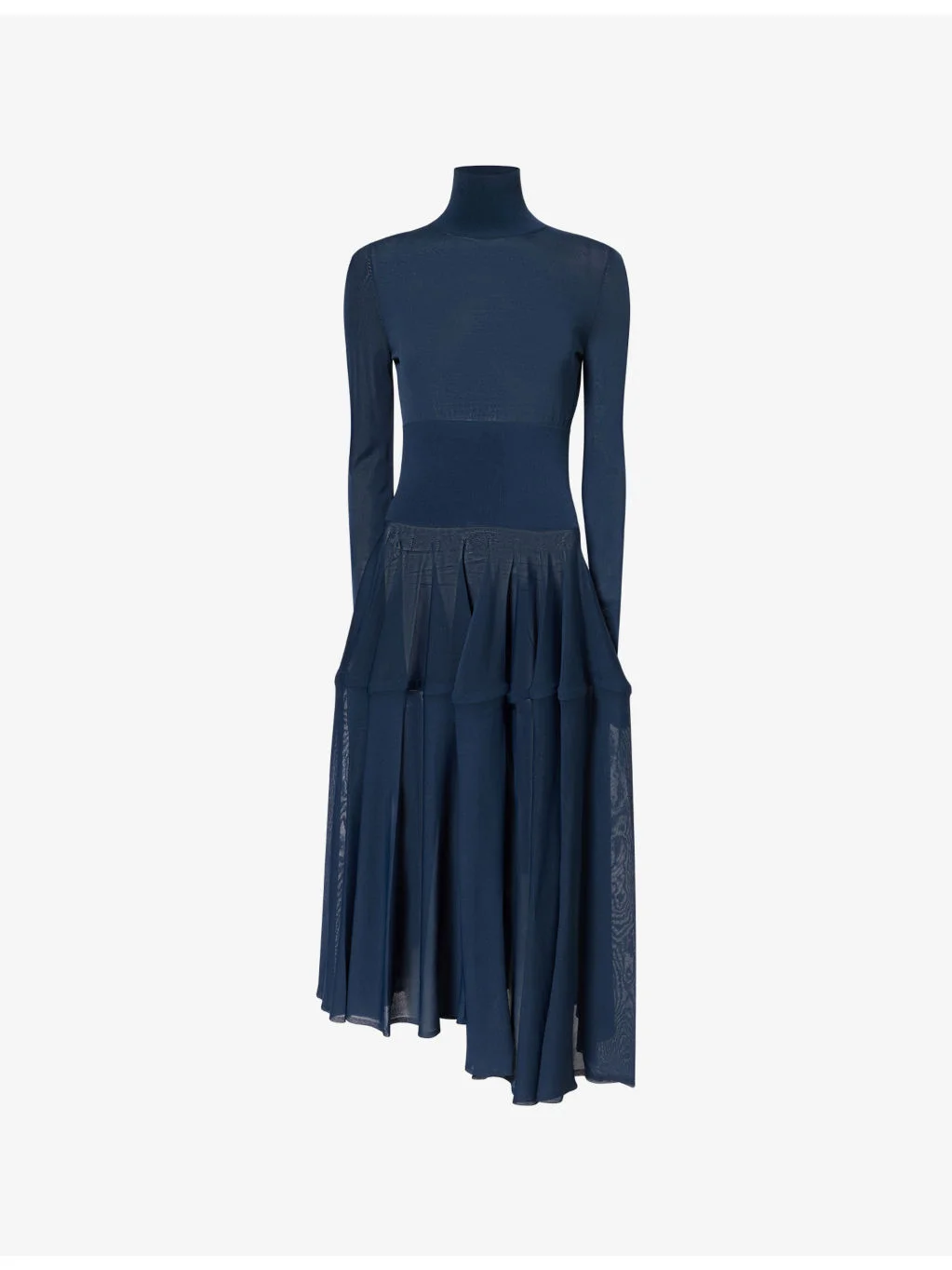 PRODUCT DETAILS - Alaia knit midi dress - 68% viscose, 31% polyamide, 1% elastane - Regular fit, high neck, long sleeves, structured skirt, semi-sheer - Dry clean - Made in Italy - True to size - Size UK 8: length 48in / 122cm - Model is 5ft 10in/1.78m and wears a size UK 8 - Midweight, slight stretch Ref: R04558212