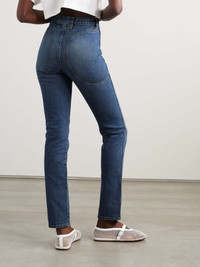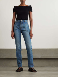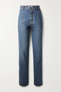 EDITORS'NOTES Alaïa's ability to enhance a silhouette is evident in this pair of jeans. Made in Italy from denim, they have a high-rise waist with hip-flattering curved seams. Complement the straight legs with ankle boots. SIZE & FIT - Fits true to size, however those who are between sizes should take the smaller size - High-rise, cut for a straight-leg fit - Mid-weight, non-stretchy denim - Size 34 jeans have an inside leg of 36"/ 93cm - Model is 177cm/ 5'10" and is wearing a FR 34 DETAILS & CARE - Blue denim - Button and concealed zip fastening at front - 100% cotton - Dry clean