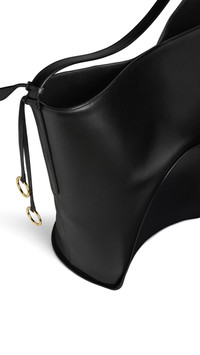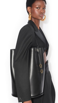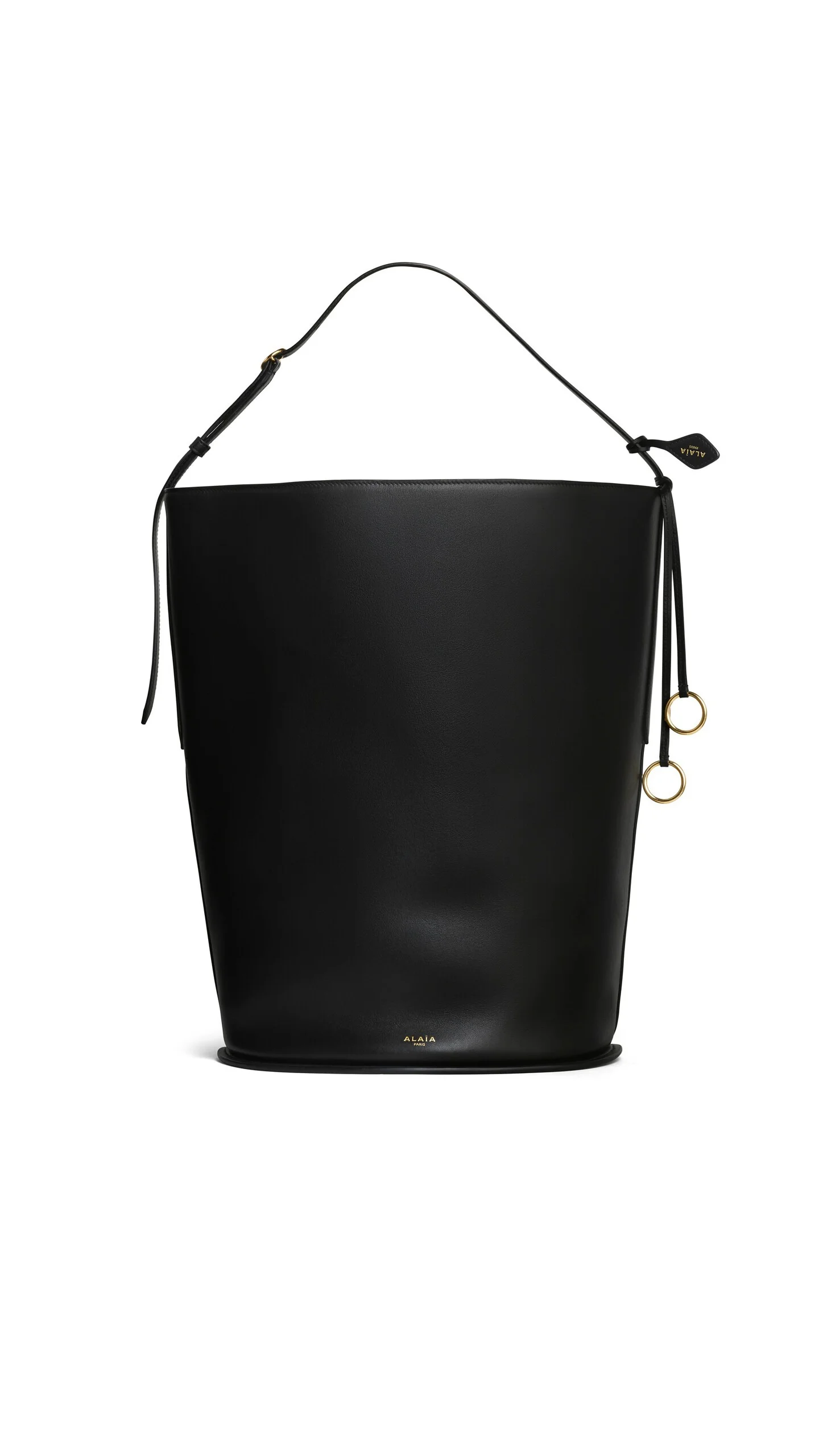 DETAILS Large bucket bag Anatomical curved shape of the molded base Adjustable strap Ring metal charms with ALAIA tag Smooth calfskin Dimensions (cm) : L 28 X D 39 X H 16 Made in Italy MATERIALS Highlights MAIN MATERIAL: 100% CALFSKIN LEATHER PRODUCT REFERENCE: AA1L6006I061-999
