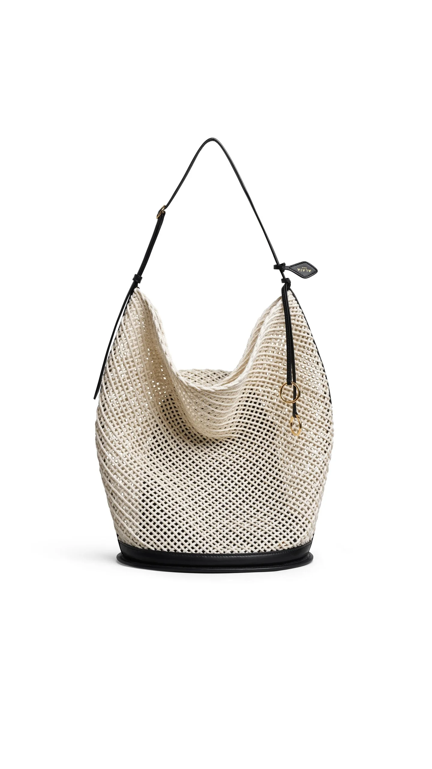 DETAILS Large bucket bag Anatomical curved shape that hugs the body Adjustable strap Decorative ties with metallic rings and Alaia tag Shoulder carry Cotton cord net and leather trims Dimensions (cm): L 28 X H 39 X D 16 Made in Italy MATERIALS MAIN MATERIAL: 100% COTTON SECONDARY MATERIAL: 100% CALF LEATHER PRODUCT REFERENCE: AA1L6006I219-120
