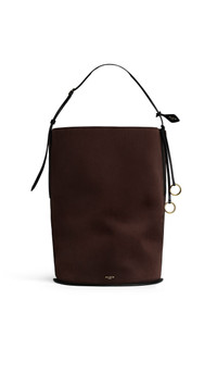 DETAILS Large bucket bag Anatomical curved shape of the molded base Adjustable strap Ring metal charms with ALAIA tag Suede and shiny goatskin Dimensions (cm) : L 28 X D 39 X H 16 Made in Italy MATERIALS Highlights MAIN MATERIAL: 100% GOATSKIN LEATHER PRODUCT REFERENCE: AA1L6006CA577-743