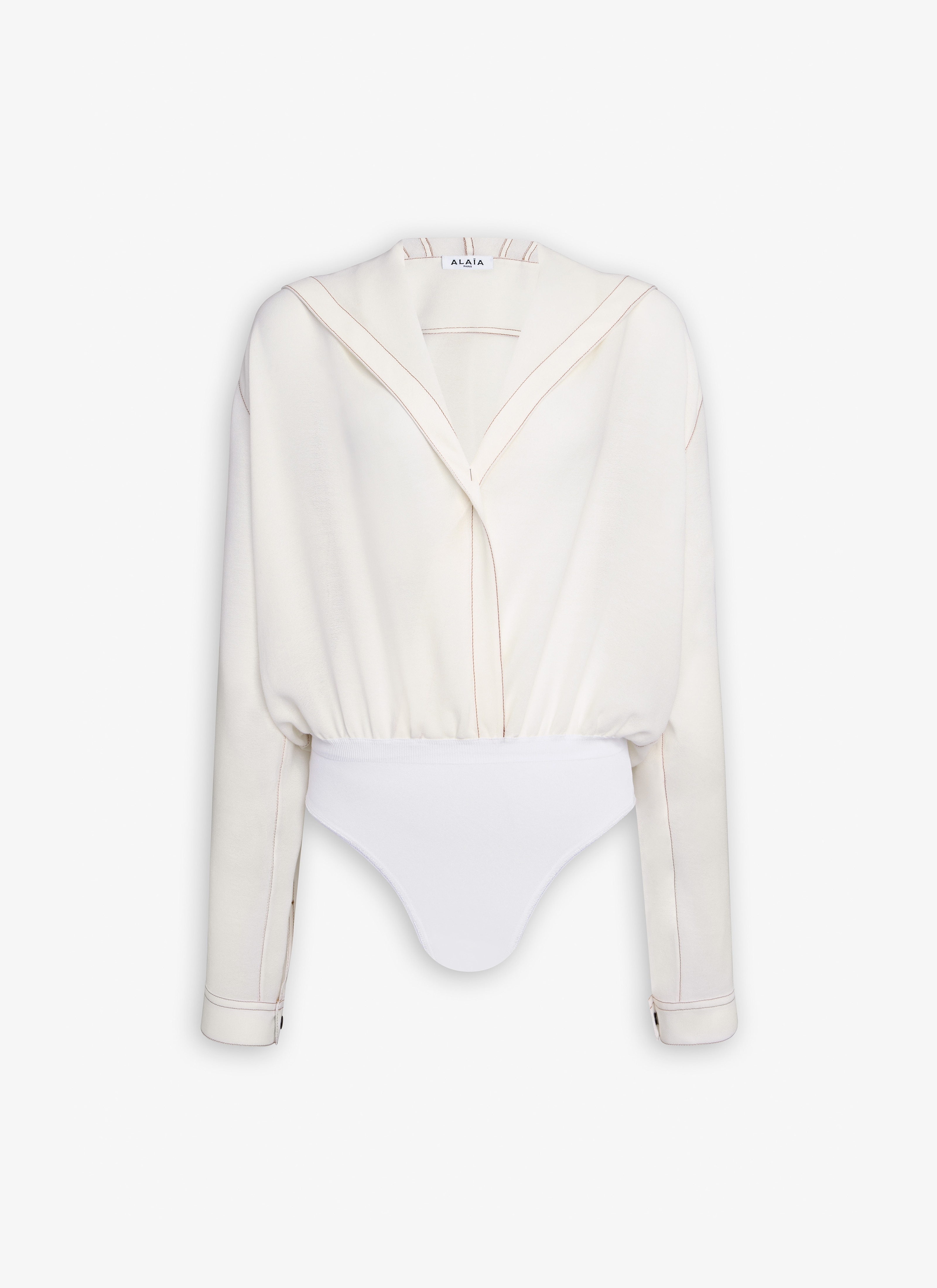 Hooded body shirt V neckline and hood Contrasting upstitching High-cut knitted briefs Crafted in wool georgette Made in Italy DETAILS COMPOSITION: 72% WOOL, 28%VISCOSE PRODUCT REFERENCE: AA9C09606T686 - 000