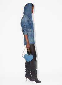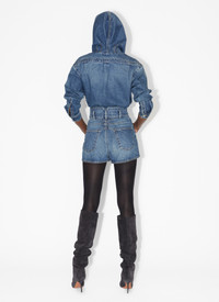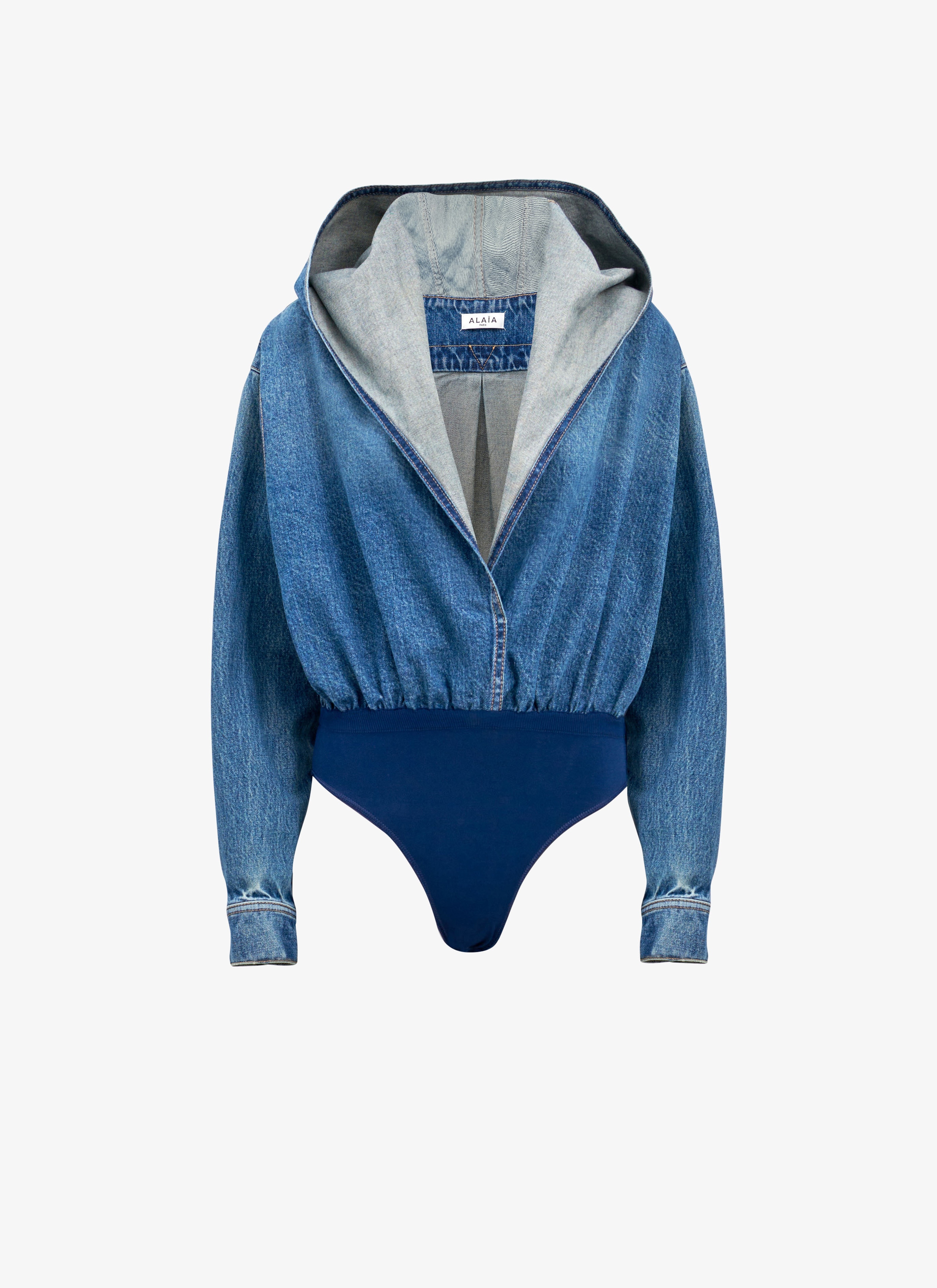Hooded denim crossed panel body, iconic and carry-over shape, deep v-neckline, long sleeves and cuffs. Made in Italy DETAILS COMPOSITION: 100% COTTON BOTTOM: 83% VISCOSE, 17% POLYESTER PRODUCT REFERENCE: AA9C08573T536 - 525