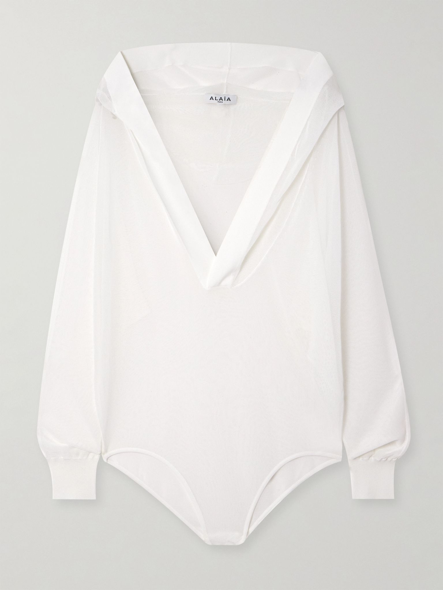 Alaia's bodysuit is made from sheer jersey that drapes loosely over your frame for a barely-there feel. It's designed with a generous hood and fitted cuffs. Underpin yours with a triangle bra for coverage and style it with anything from jeans to tailoring. Size & Fit - Fits true to size, take your normal size - Designed for a loose fit - Medium brief coverage - Lightweight knit - French sizing Details & Care - White jersey - Snap fastenings at base - 75% viscose, 24% polyamide, 1% elastane - Dry clean