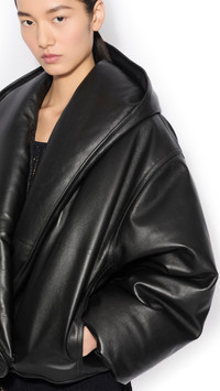 DETAILS Hooded bomber jacket in lambskin leather Round fit Dropped shoulders Integrated hood, concealed snap closure and internal pocket Made in Italy MATERIALS Highlights MAIN MATERIAL: 100% LAMBSKIN POCKET LINING: 100% COTTON LINING: 100% POLYAMIDE PRODUCT REFERENCE: AA9V1247C228C-995