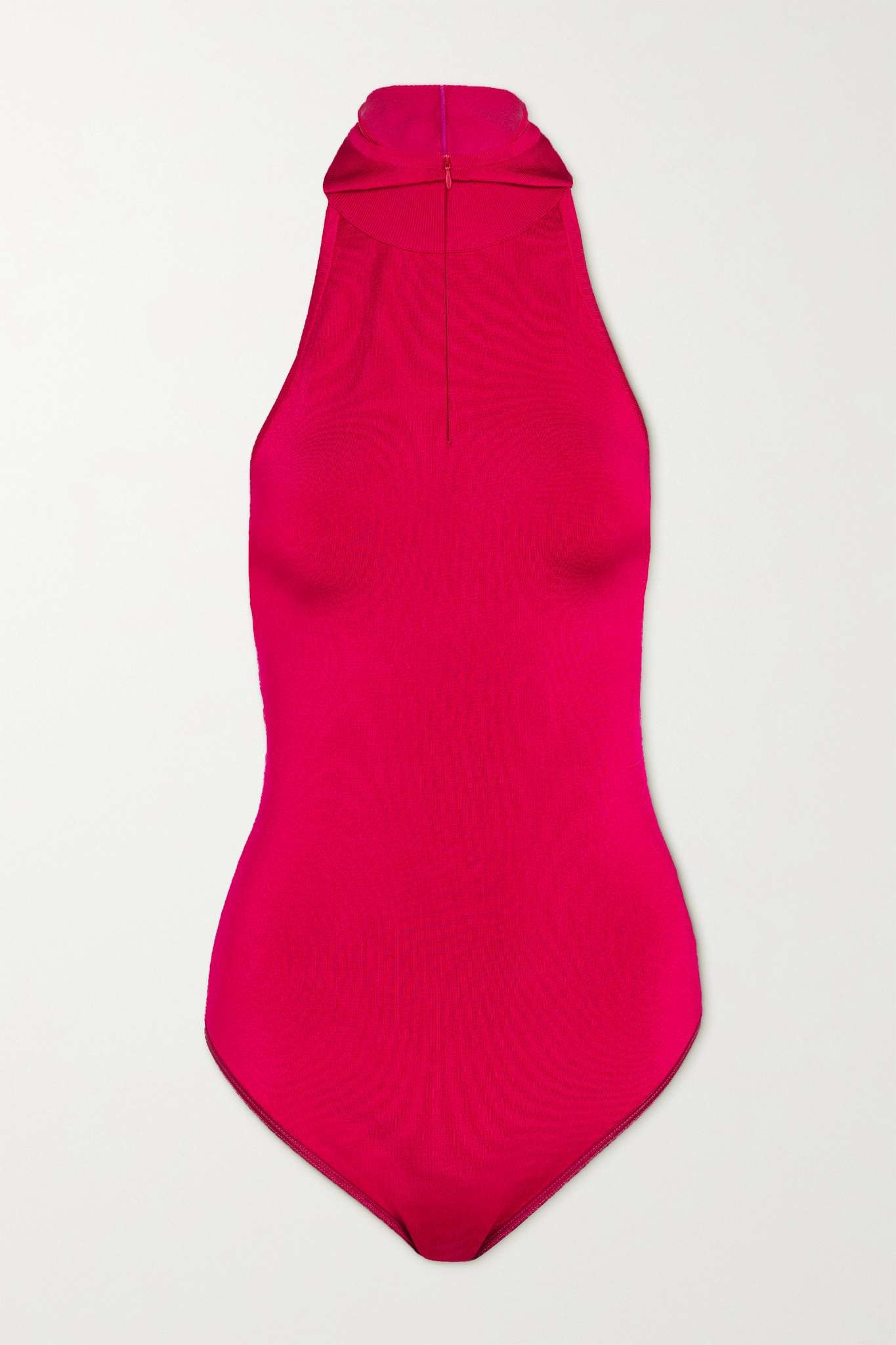 EDITORS'NOTES The beauty of Alaïa's bodysuit is that it can so easily be dressed up or down. Made from stretch-knit, it's designed for a very close fit and has an equally streamlined hood. Echo the styling at Pieter Mulier's Spring '22 show by wearing yours underneath loosely draped layers. SIZE & FIT Alaïa follows a new size guide. Please refer to size and fit information below. - Fits true to size, take your normal size - Those with a petite frame may wish to take the next size down - Designed for a close fit - Medium brief coverage - Lightweight, stretchy fabric - Model is 177cm/ 5'10" and is wearing a FR 36 DETAILS & CARE - Fuchsia stretch-knit - Concealed zip fastening along back - 80% viscose, 19% polyamide, 1% polyurethane