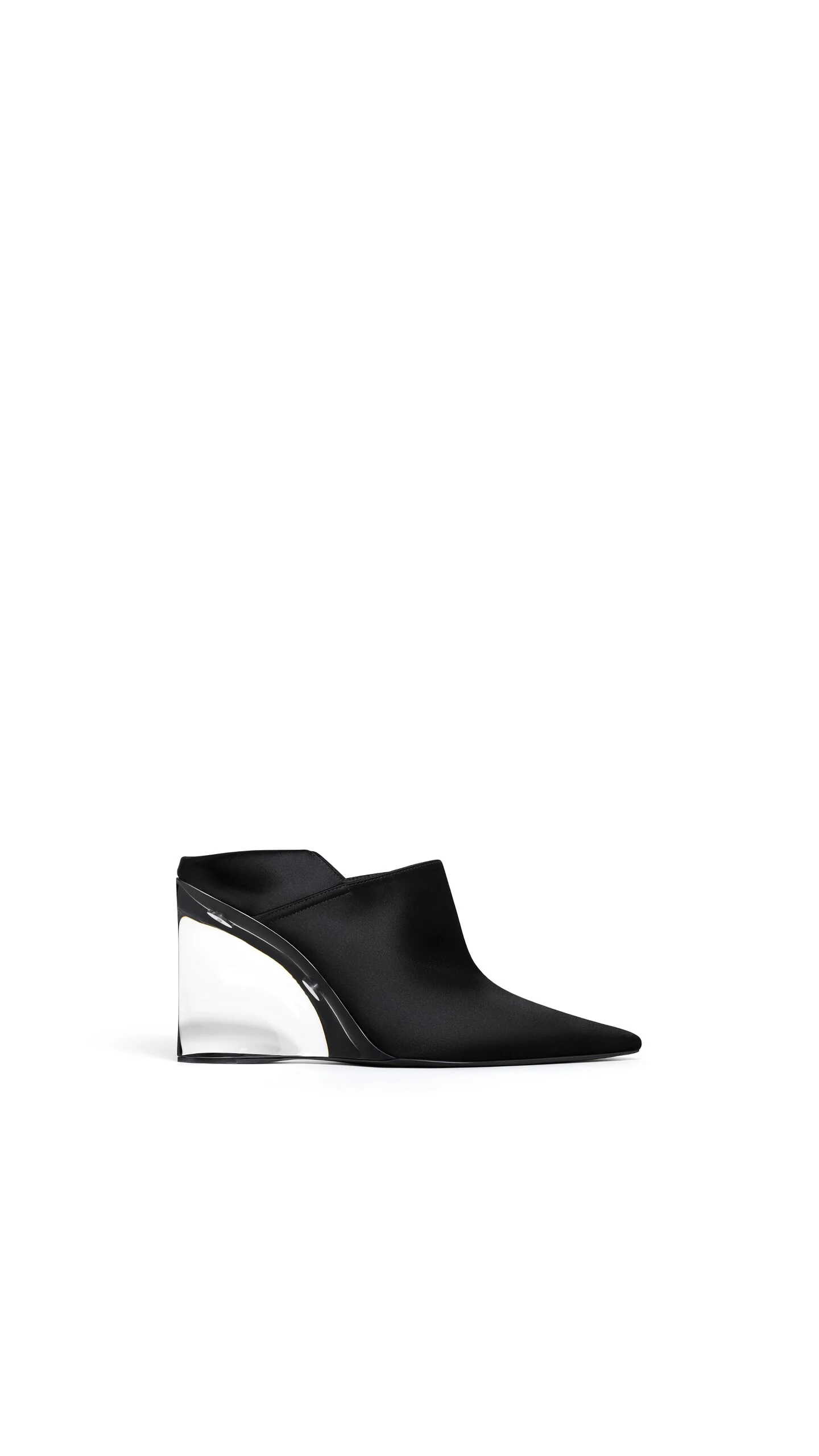 DETAILS Wedge mules with transparent plexi heel 90 mm heel Pointed toe and rear Folded heel counter Signed Alaia rivets Satin fabric Leather sole Made in Italy MATERIALS MAIN MATERIAL: 72% VISCOSE, 28% SILK MAIN LINING: 100% LAMB LEATHER OUTER SOLE: 50% CALF LEATHER, 50% RUBBER PRODUCT REFERENCE: AA3M3008A024-999
