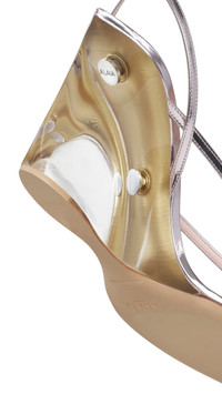 DETAILS Wedge thong sandals with plexi heel 90 mm heel Tappered toe and rear Crisscrossed ankle strap Signed Alaia rivets Mirror calfskin leather Leather sole Made in Italy MATERIALS MAIN MATERIAL: 100% CALF LEATHER MAIN LINING: 100% LAMB LEATHER OUTER SOLE: 50% CALF LEATHER, 50% RUBBER BUCKLE: 100% ZAMAK PRODUCT REFERENCE: AA3S3007I137-428