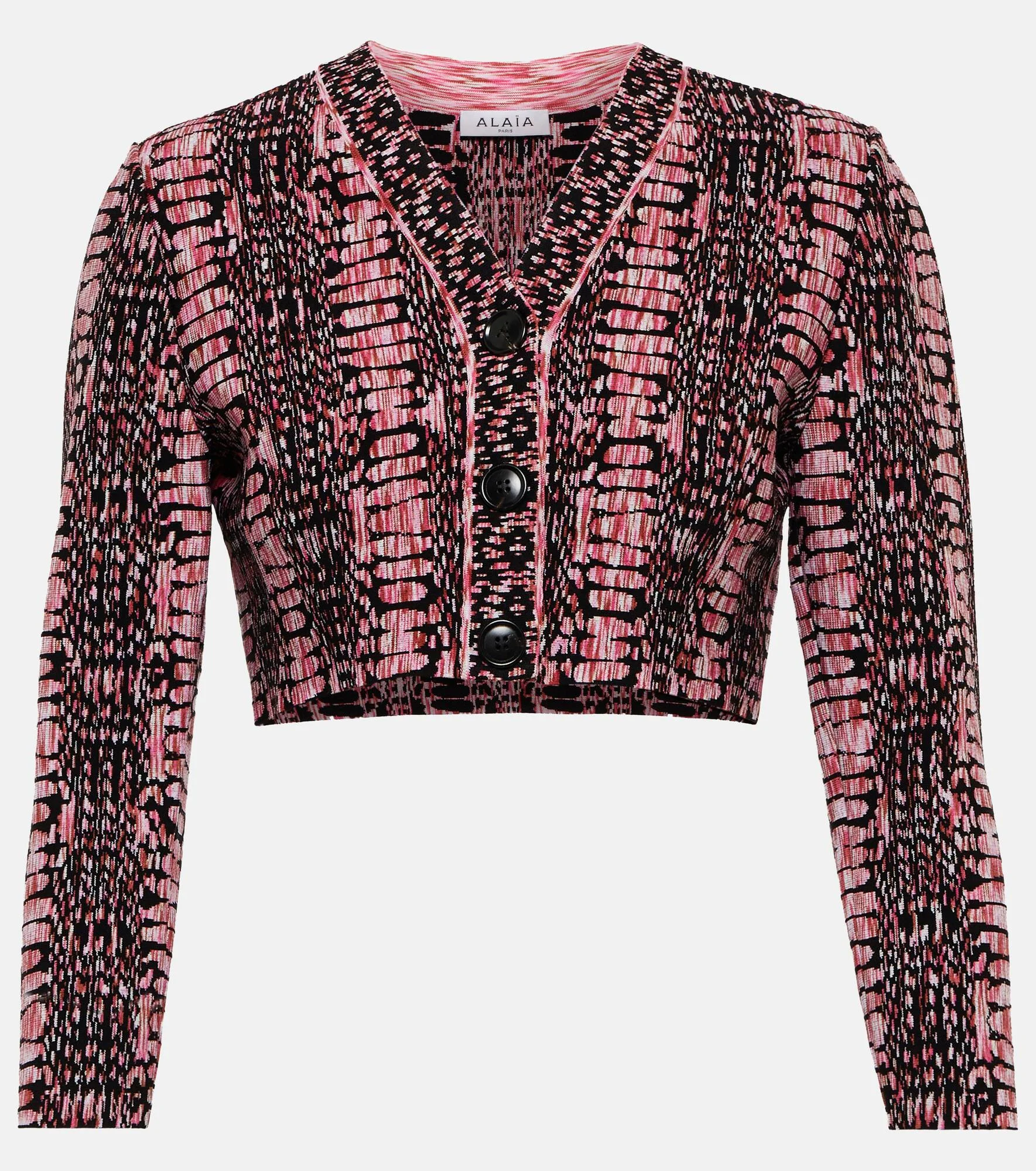 Alaïa puts a fierce spin on knitwear with this python-effect jacquard cardigan. Made from a stretchy knit fabric, it's cut to a midriff-baring cropped length. - material: 48% viscose, 42% polyamide, 10% polyester, 2% elastane - care instructions: specialist clean - buttoned front - Made in Italy - Designer colour name: Noir/Rose - Runs small, please see Size & Fit tab
