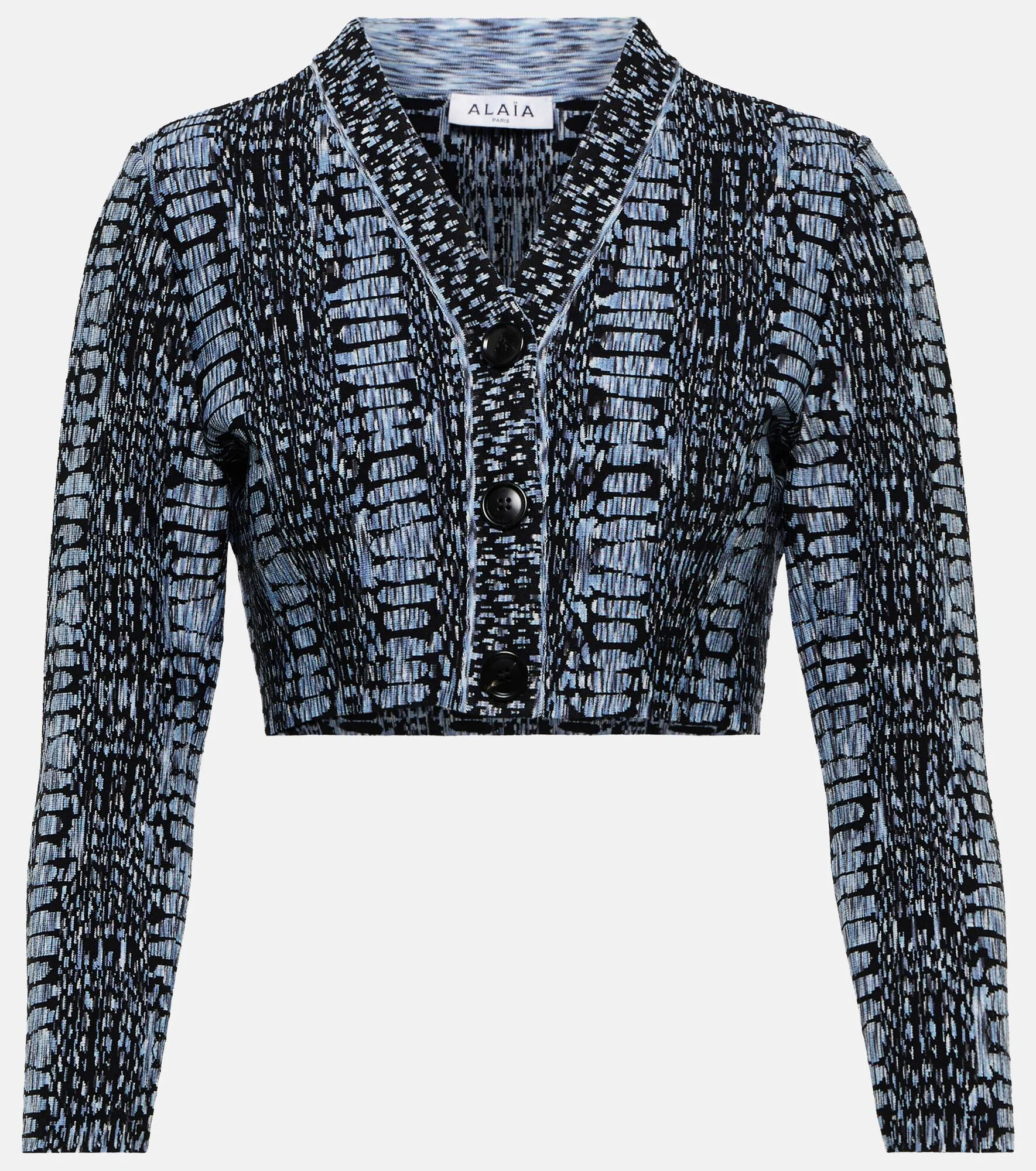 Alaïa puts a fierce spin on knitwear with this python-effect jacquard cardigan. Made from a stretchy knit fabric, it's cut to a midriff-baring cropped length. Product Details - Made in Italy - Material: 10% polyester, 42% polyamide, 46% viscose, 2% elastane - Closure: buttoned front - Care instructions: dry clean - Item number: P00634481 Size & Fit - Fits small to size - we recommend trying one size larger - Fitted - Mid-weight material - Cropped - The model seen in the picture is 178cm-5'10" and wearing a size FR 38