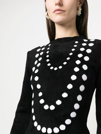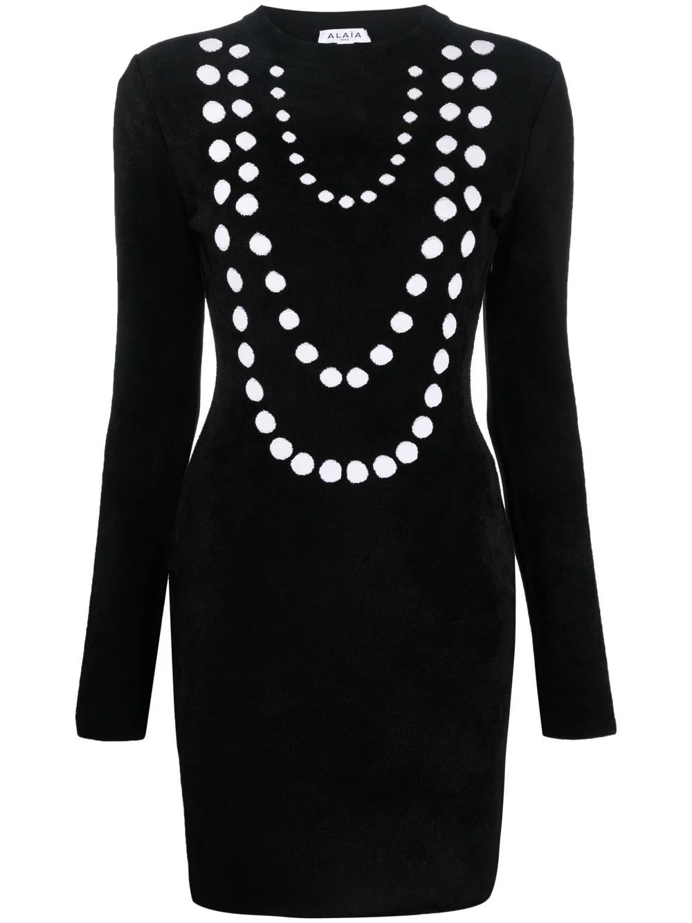 jacquard-knit minidress Alaia puts a fresh spin on the classic minidress for SS23. Spun from a soft wool blend, this piece is elevated with a dotted jacquard motif that resembles a pearl necklace. Made in Italy Composition Wool 50%, Viscose 23%, Polyamide 19%, Polyester 7%, Spandex/Elastane 1% SIZE & FIT Model measurements Height 5 ft 10 in(1.77 m) Bust/Chest 35.03 in(89 cm) Hips 35.03 in(89 cm) Waist 23.62 in(60 cm) FittingInformation This piece fits true to size. We recommend you get your regular size Cut for a close fit Made with a mid-weight stretch fabric