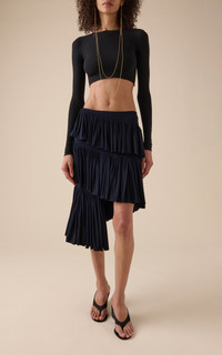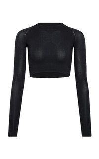 Founded by Azzedine Alaia, today the maison, under the direction of Pieter Mulier, continues the revered couturier's uncompromising vision which champions masterful cuts that accentuate the female form. Crafted from signature knit, this tight-fitting long sleeve crop features a banded under-bust that keeps the garment secure and in-place. PRODUCT DETAILS - Spring/Summer '25 - Slip on - Composition: 50% Wool, 50% Acrylic - Designer color: Noir Alaia - Dry clean only - Made in France SIZE & FIT - Our model is wearing a size FR 34 - Model is 5'11" with a 31.5" bust, 23" waist, and 34.5" hip - Designed for a tight fit