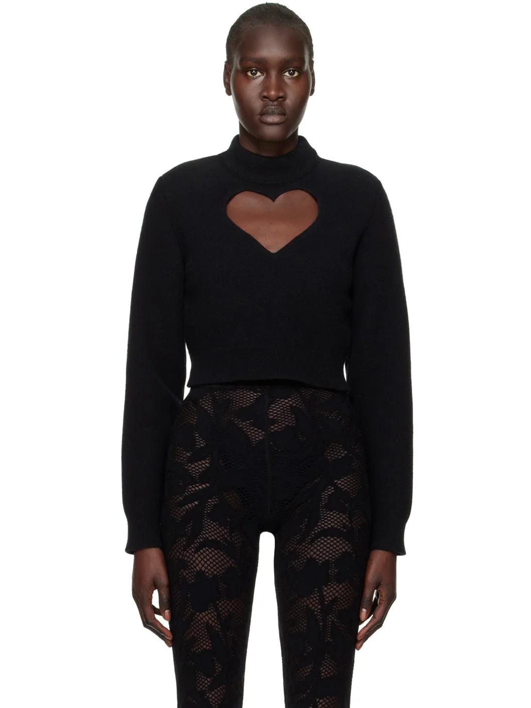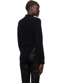 Brushed knit boiled virgin wool sweater. · Rib knit mock neck, hem, and cuffs · Graphic cutout at chest Supplier color: Black 100% virgin wool.