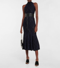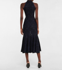 Made from a semi-sheer fabric, this midi dress from Alaïa has a high neck, scalloped edges and a fit-and-flare silhouette. Product Details - Made in Italy - Material: 7% polyester, 93% viscose - Closure: zipped back - Designer color name: Marine/Noir - Care instructions: do not wash - Item number: P00700889 Size & Fit - True to size - Semi-sheer - Fitted - Mid-weight material - Stretchy fabric - The model seen in the picture is 178cm-5'10" and wearing a size FR 36