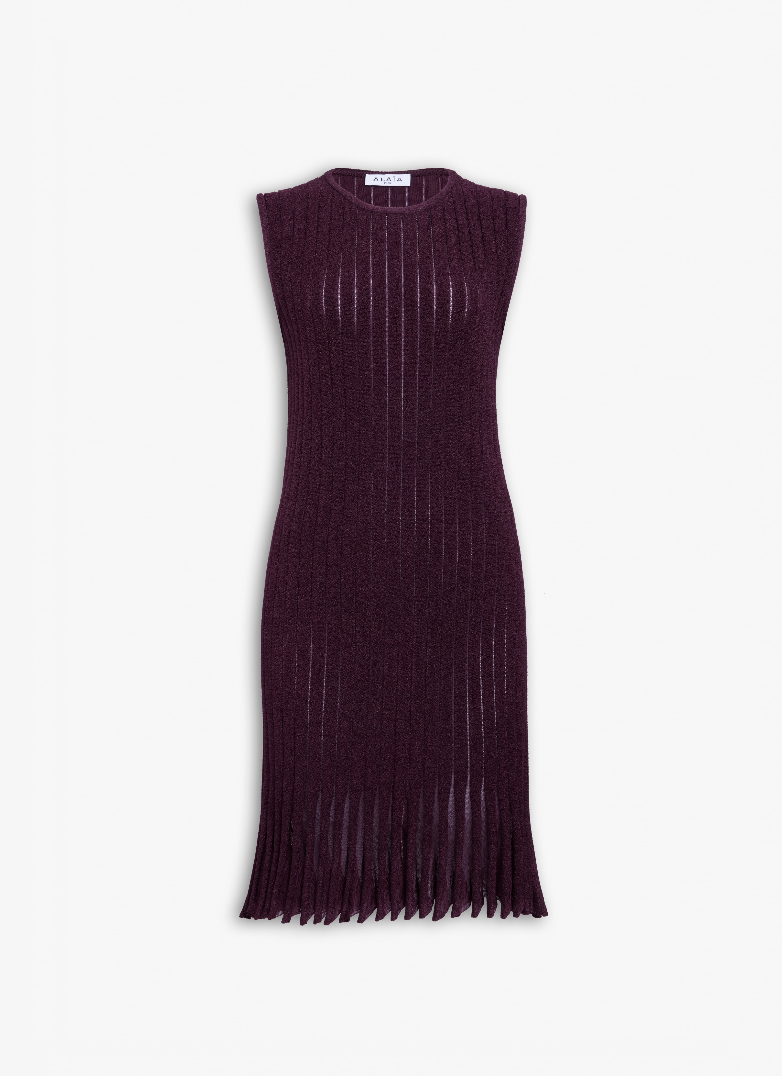Sleeveless fluted dress knitted from interlace terry knit enhanced with vertical stripes High waist, thigh length, crew neck Fit and flare cut Made in Italy DETAILS MAIN MATERIAL : 73% VISCOSE 15% POLYESTER 12% SILK PRODUCT REFERENCE : AA9R2715K084B - 413