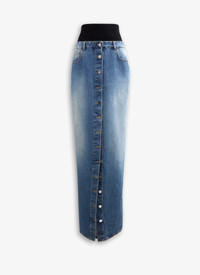 Long faded blue denim skirt Straight cut High waist, integrated knit waistband, contrasting topstitching, metal button fastening Made in Italy DETAILS COMPOSITION: 99% COTTON, 1% POLYURETHANE POCKET LINING: 65% POLYESTER, 35% COTTON PRODUCT REFERENCE: AA9J0601T536A - 525