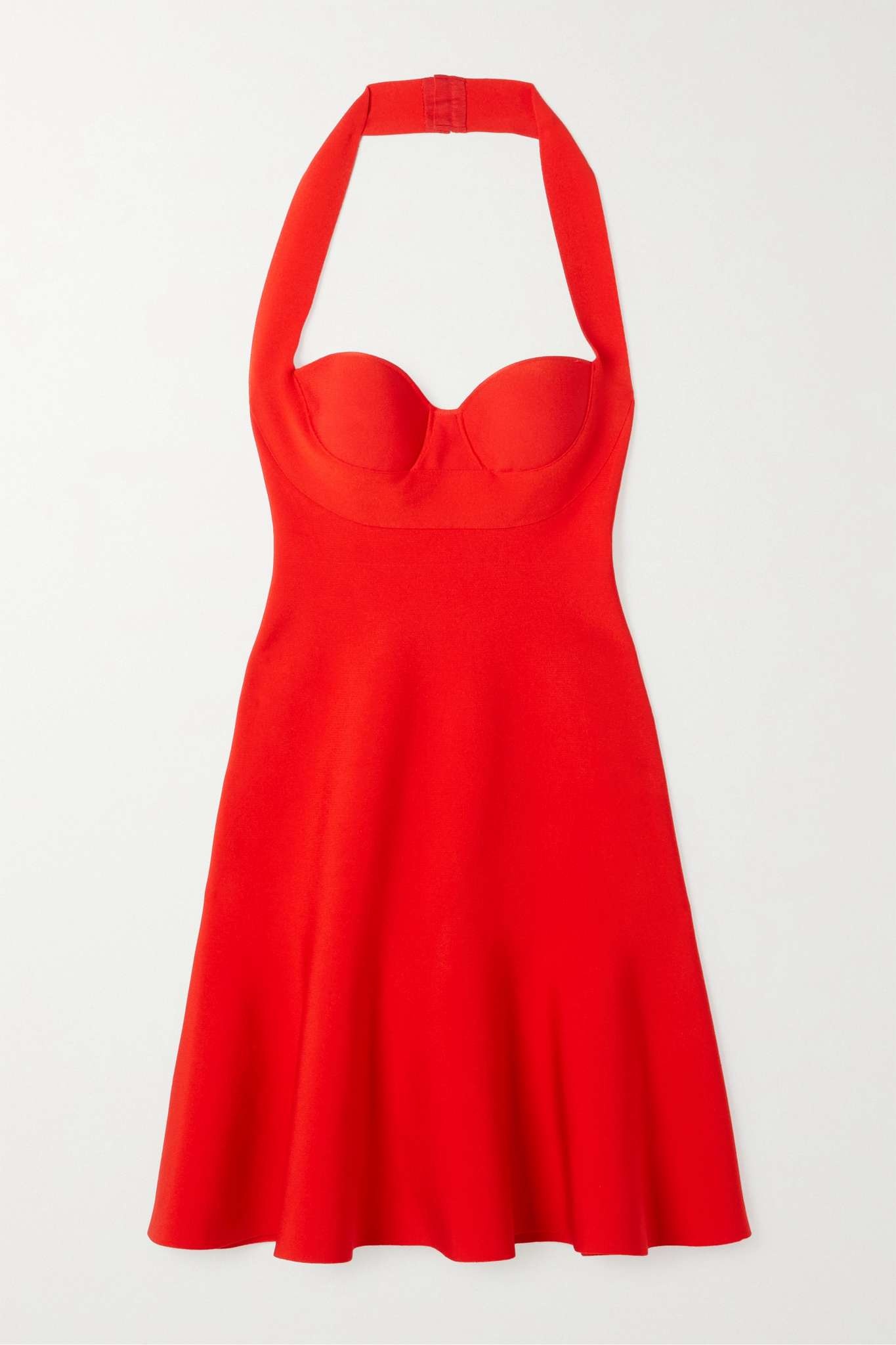 EDITORS'NOTES The defined cups on Alaïa's knitted dress have been a house signature since the late-'80s supermodel era. It's designed for a second-skin fit with sweeping halterneck straps and an elegant fluted hem. Heels are the obvious choice but ballet flats would look so chic, too. SIZE & FIT - Fits true to size, however those who are between sizes should take the smaller size - Designed for a close fit - Internal bust support - Mid-weight, slightly stretchy fabric - Model is 180cm/ 5’11” and is wearing a FR 34 DETAILS & CARE - Red viscose, polyamide, polyester and polyurethane-blend - Hook fastenings at neck, concealed zip fastening along back - 62% viscose, 23% polyamide, 13% polyester, 2% polyurethane