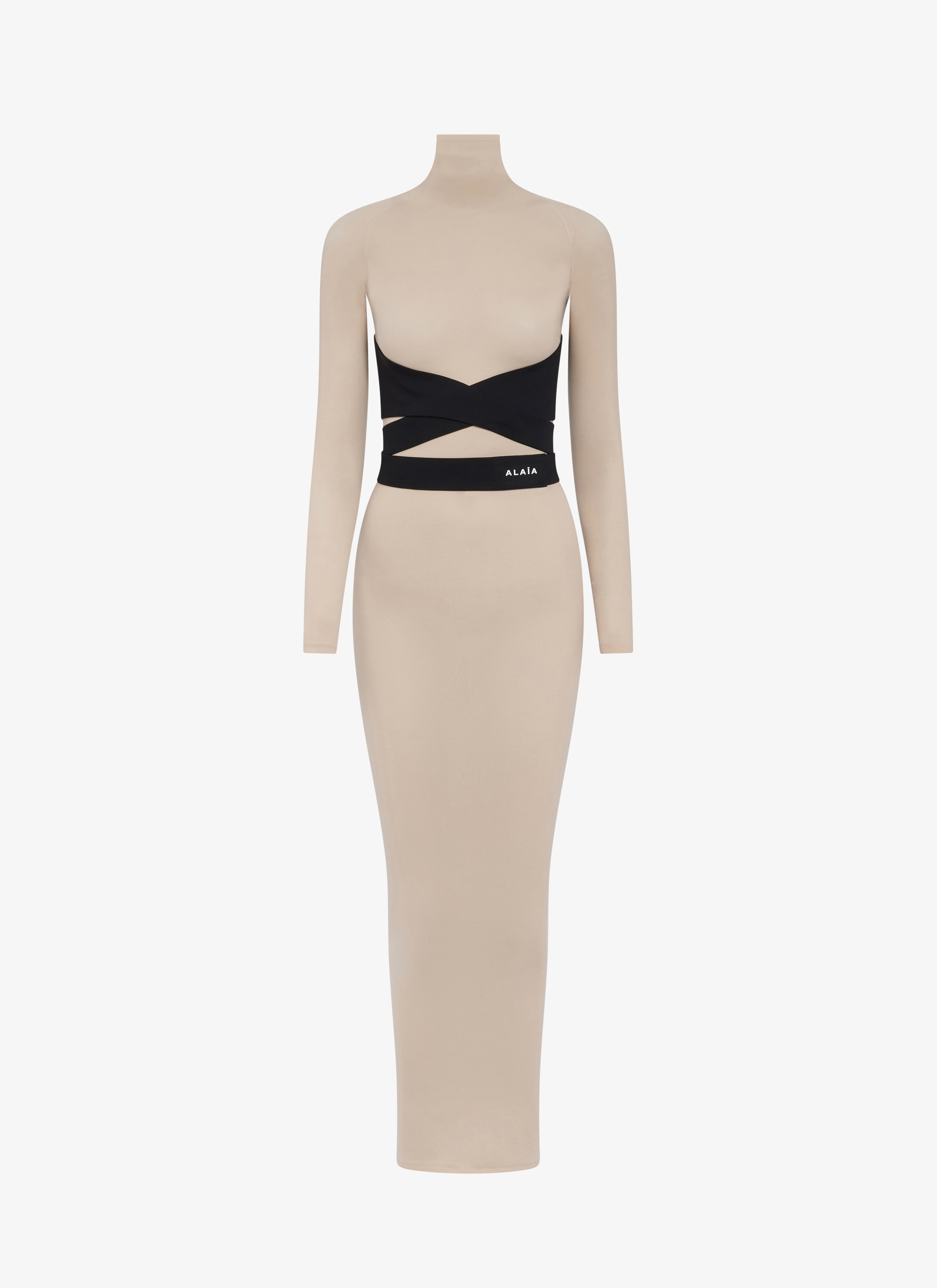 second skin band dress high neck, long sleeves modern sculpted clean silhouette contrasting jersey cross-over band belt with velcro fastening knitted in a matt fine gage elastic nylon yarn made in italy DETAILS COMPOSITION: 75% POLYAMIDE ADDITIONAL MATERIAL: 25% ELASTANE PRODUCT REFERENCE: AA9R23844M827 - 178