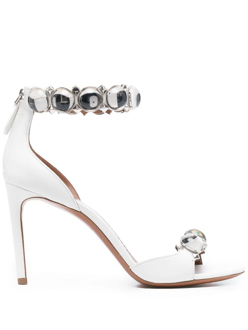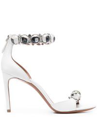 Bombe 95mm sandals chalk white calf leather open toe beaded trim detail ankle strap rear zip fastening high cone heel Made in Italy Composition Outer: Lamb Skin 100%, Polymethyl Methacrylate 100% Lining: Leather 100% Sole: CALFSKIN 100% SIZE & FIT Measurement CIRCUMFERENCE 8.66 in(22 cm) HEEL 3.74 in(9.5 cm) HEIGHT 3.54 in(9 cm) Sole height 0.39 in(1 cm)