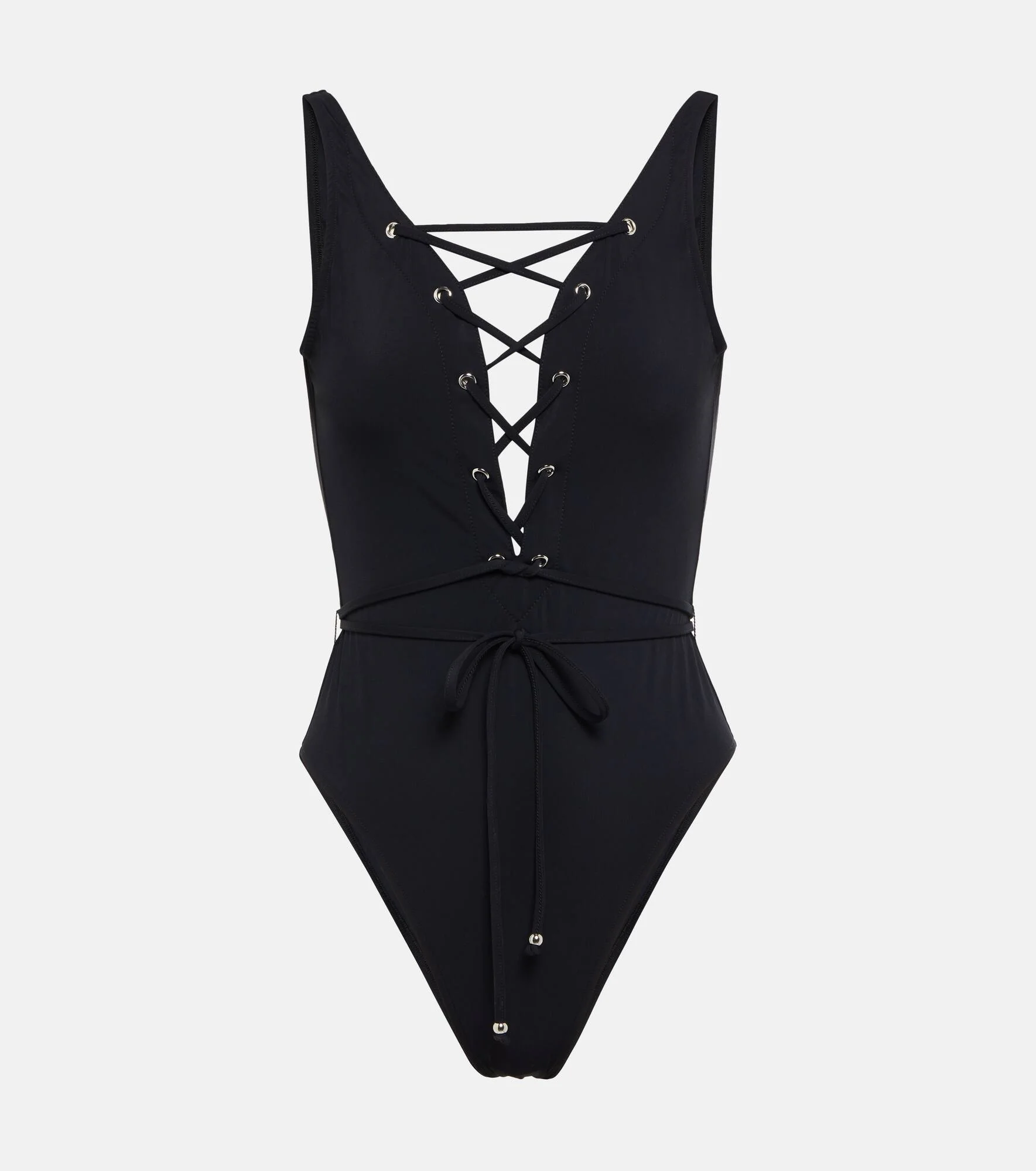 This one-piece swimsuit from Alaïa has a plunging V-neckline with crisscrossing lace-up details in the front. The design comes with high-leg bottoms for a contemporary feel. Product Details - Made in Italy - Care instructions: machine wash at 30 degrees - Material: 40% elastane, 60% polyamide - Designer color name: Noir Alaia - Item number: P00753149 Size & Fit - Fits small to size - we recommend trying one size larger - High-cut leg - The model seen in the picture is 178cm-5'10", cup size B, and wearing a size FR 38 - Unpadded Top