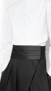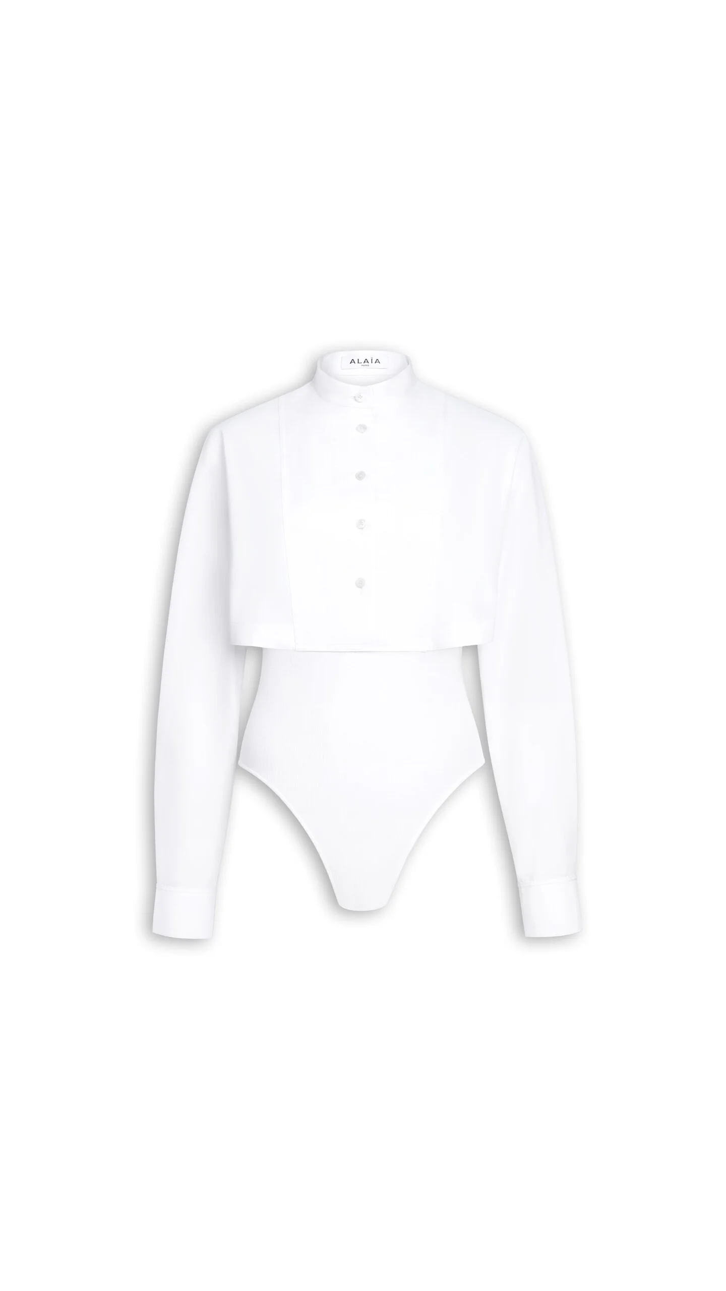 DETAILS Layered body-shirt in crisp cotton poplin Band collar, long sleeves, front plastron, low back cut Ribbed body, cropped shirt Snap closure, fabric covered buttons Made in Italy MATERIALS Highlights MAIN MATERIAL: 100% COTTON RIBBING: 93% COTTON, 7% ELASTANE PRODUCT REFERENCE: AA9B0416T611C-000