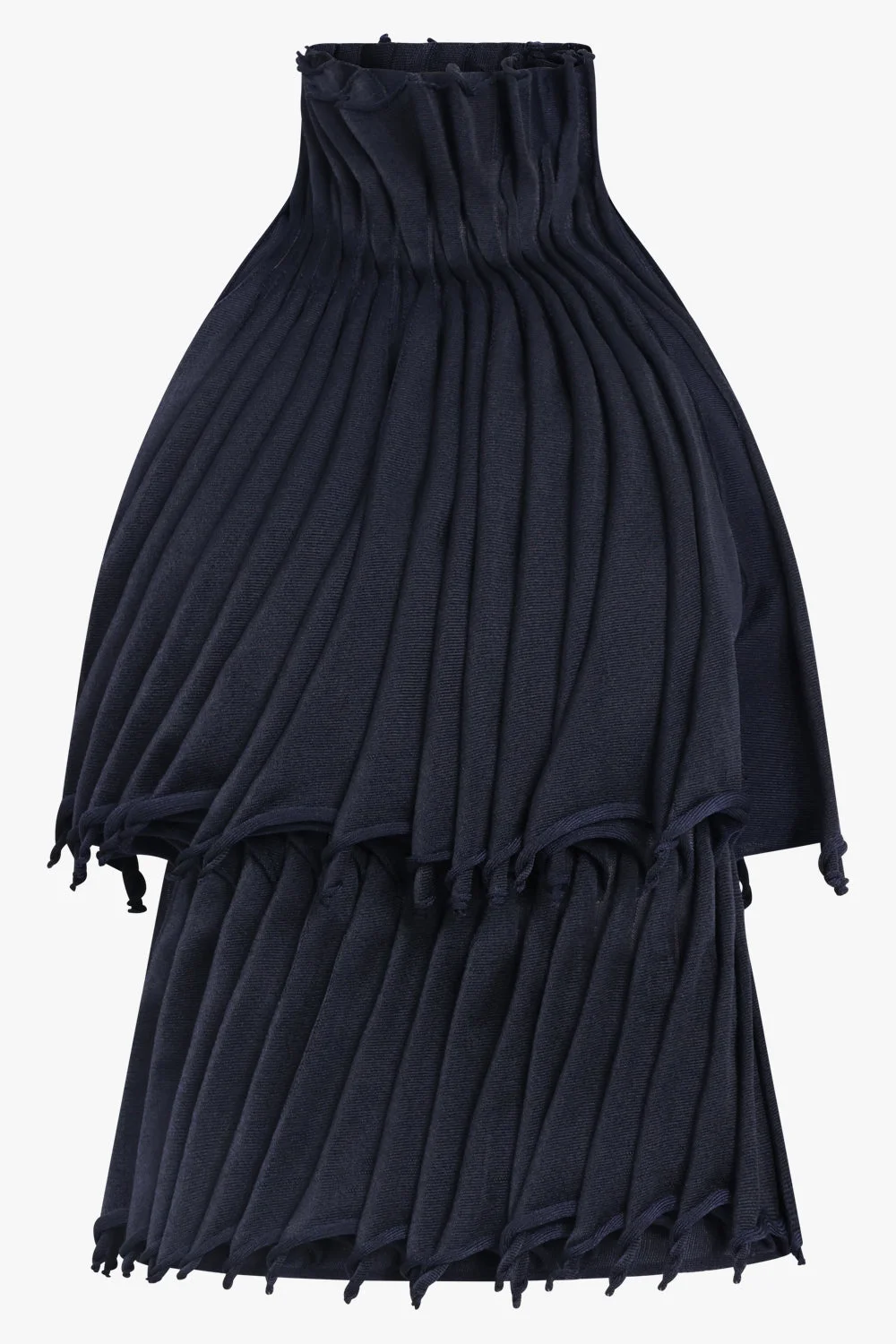 This striking Layered Sleeveless 3D Pleat Top in Midnight by Alaia exemplifies the maison’s mastery of architectural texture and sculptural knitwear. Crafted in a Japanese nylon yarn that forms three-dimensional fins protruding from the base, the design creates a layered effect with a sleek, fitted silhouette and high neck. Sleeve-free for effortless layering, the piece features collar side buttons that add a subtle functional detail, marrying elegance with innovation. - Fabrication: 100% Nylon (Japanese fins knit) - Fitted style with layered 3D fin structure - High neck neckline - Sleeveless design with collar-side button closure - Midnight colourway lends timeless versatility - Hybrid construction showcasing Alaia’s signature sculptural aesthetic Style with tailored trousers and minimalist accessories for a refined directional look. Size and Fit Tiah: Model is 178cm/5’9” and is wearing a size FR38 Model Measurements: Bust: 86cm, Waist: 69cm, Hips 90.5cm Fits true to size