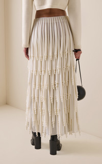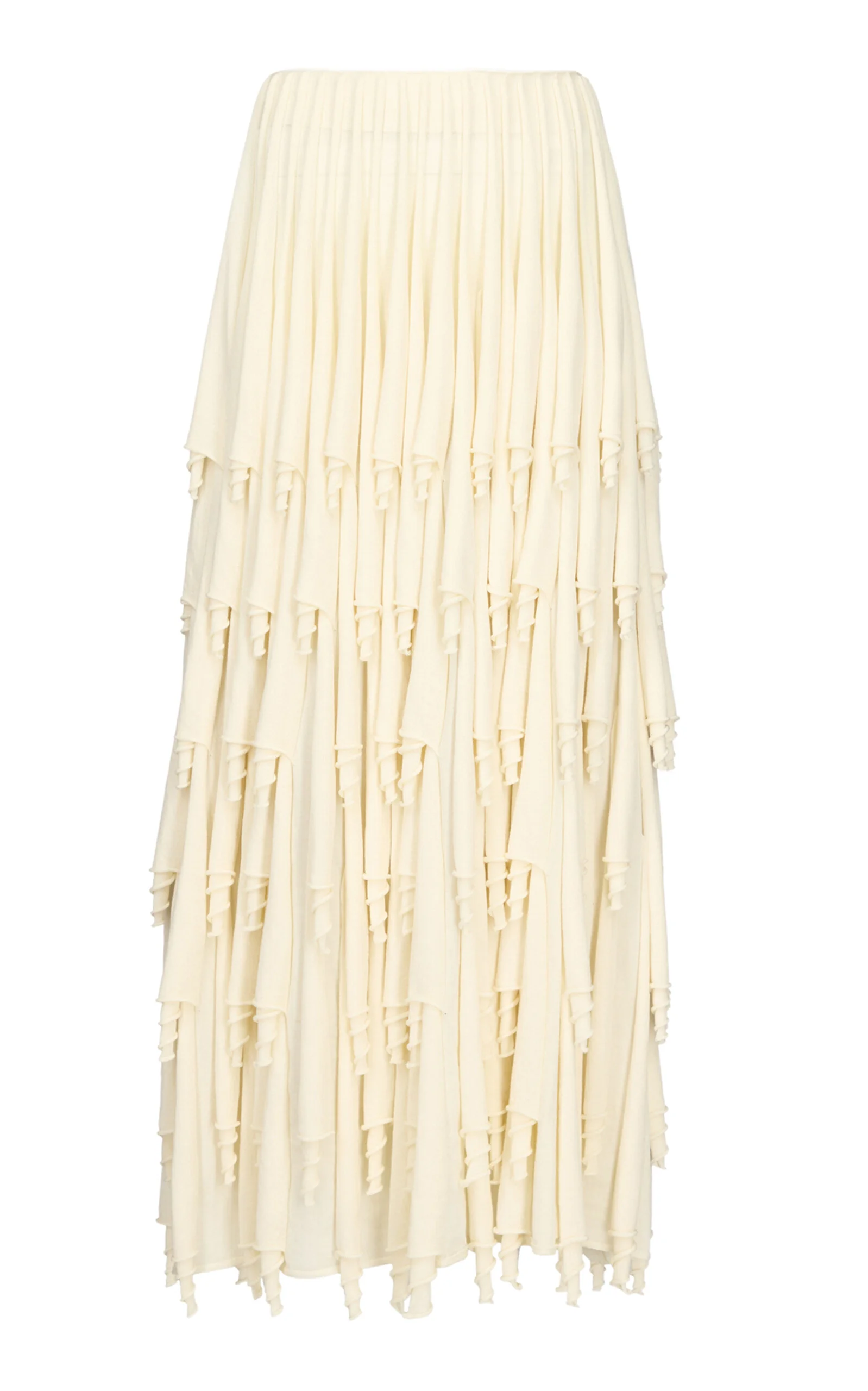 Founded by Azzedine Alaia, today the maison, under the direction of Pieter Mulier, continues the revered couturier's uncompromising vision which champions masterful cuts that accentuate the female form. This unique skirt is designed to sit low on the waist and fall gracefully to the ankle. It’s constructed from a finely woven material – made with wool and silk – to encourage the twisted pleats and conical fringes. Style this look with one of the Maison’s cropped sweaters. PRODUCT DETAILS - Fall/Winter ‘25 - Slip on - Composition: 58% wool, 41% silk, 1% polyamide - Dry clean - Designer Color: Natural White - Made in Italy SIZE & FIT - Our model is wearing a size FR 34 - Model is 5'10" with a 30" bust, 24" waist, and 34" hip
