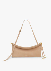 East West curved bag that hugs the body Hinge opening system wrapped with leather Signature folding detail on the bottom of the bag Decorative ties with metallic rings Shoulder or cross body carry thanks to an adjustable strap Soft feel nubuck calfskin leather Dimensions (cm) : L 30 X H 14 X D 9 Made in Italy DETAILS MAIN MATERIAL : 100% CALFSKIN LEATHER MAIN LINING : 100% CALFSKIN LEATHER PRODUCT REFERENCE : AA1S01430CA214-148