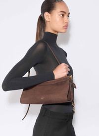 East West curved bag that hugs the body Hinge opening system wrapped with leather Signature folding detail on the bottom of the bag Decorative ties with metallic rings Shoulder or cross body carry thanks to an adjustable strap Soft feel nubuck calfskin leather Dimensions (cm) : L 30 X H 14 X D 9 Made in Italy DETAILS MAIN MATERIAL:100% CALFSKIN LEATHER MAIN LINING:100% CALFSKIN LEATHER PRODUCT REFERENCE : AA1S01430CA214 -733