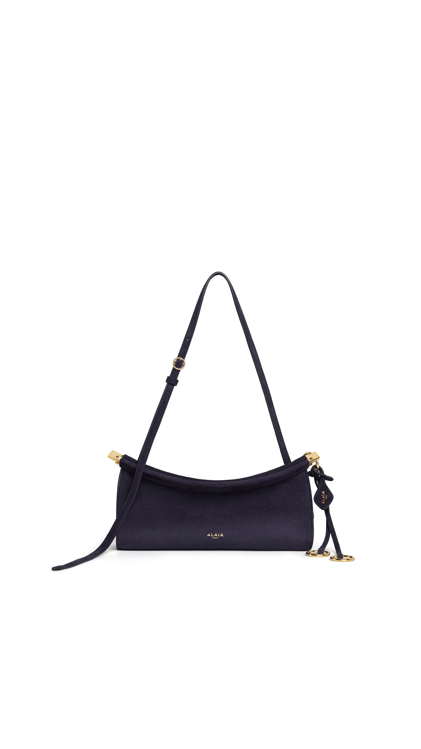 DETAILS Small East West curved bag that hugs the body Hinge opening system wrapped with leather Signature folding detail on the bottom of the bag Decorative ties with metallic rings Shoulder carry Suede goatskin leather Dimensions (cm) : L 25 X H 12,5 X D 7 Made in Italy MATERIALS Highlights MAIN MATERIAL: 100% GOATSKIN PRODUCT REFERENCE: AA1S01426CA328-413