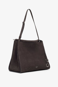 Grey nubuck leather shoulder bag from Alaia. The Le Click shoulder bag is made of nubuck leather in a curved square shape that hugs the body. It has a discreet pocket with hinge opening system wrapped with leather, completed by one large front gusset with magnetic closure. It has a signature folding detail on the bottom of the bag, complete with decorative ties with metallic rings. - Measurements: L24 x H18.5 x W12 cm - Made in Italy Product Code: AA1S01433CA214840